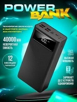 Power Bank внешний аккумулятор 40000 mAh с быстрой зарядкой и фонариком, черный