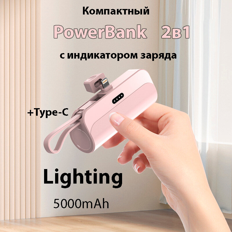 Купить Внешний аккумулятор 2в1 5000 mAh основной lighting и шнур Type-C, Powerbank MINI (Розовый)