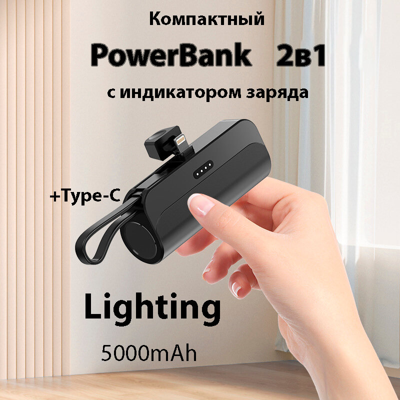 Внешний аккумулятор 2в1 5000 mAh основной Type-C и шнур lighting , Powerbank MINI (Чёрный)