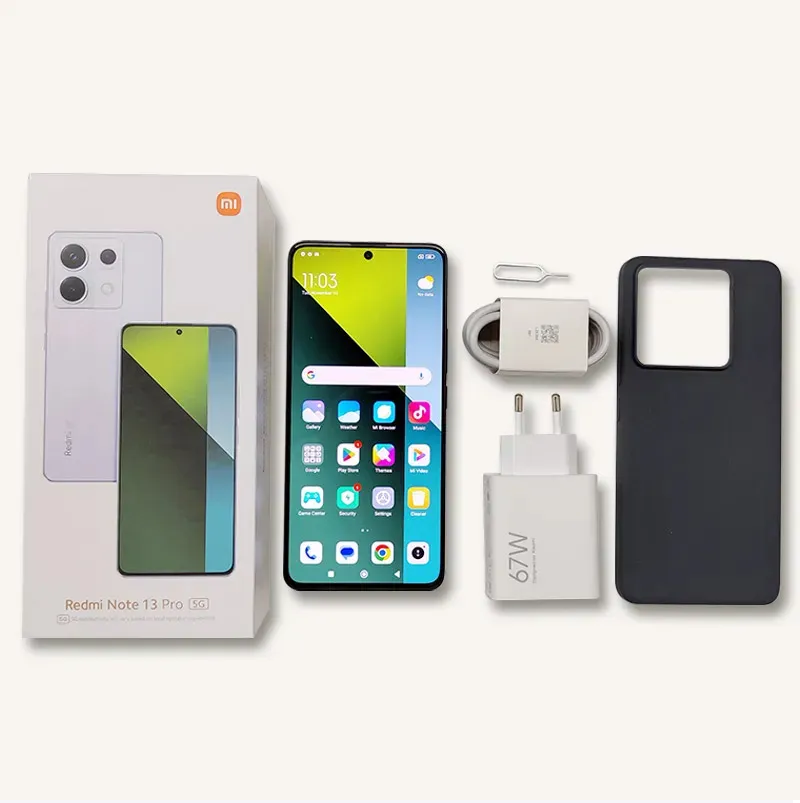 | Заводская комплектация | Redmi Note 13 Pro 5G телефон с предварительно нанесенной пластиковой защитной пленкой для экрана Блок зарядки мощностью 67 Вт с выходом USB-A Кабель для зарядки (от USB-A до USB-C) Силиконовый чехол Инструмент для SIM-карты Инструкции по эксплуатации |