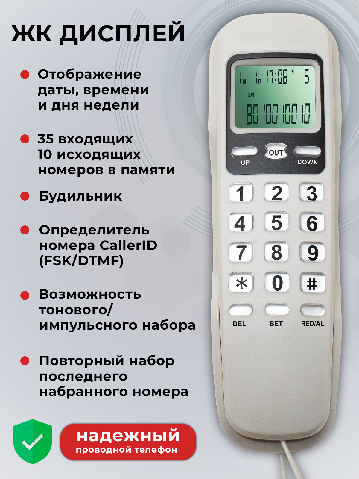 | Особенности | возможность настенной установки, повторный набор номера |