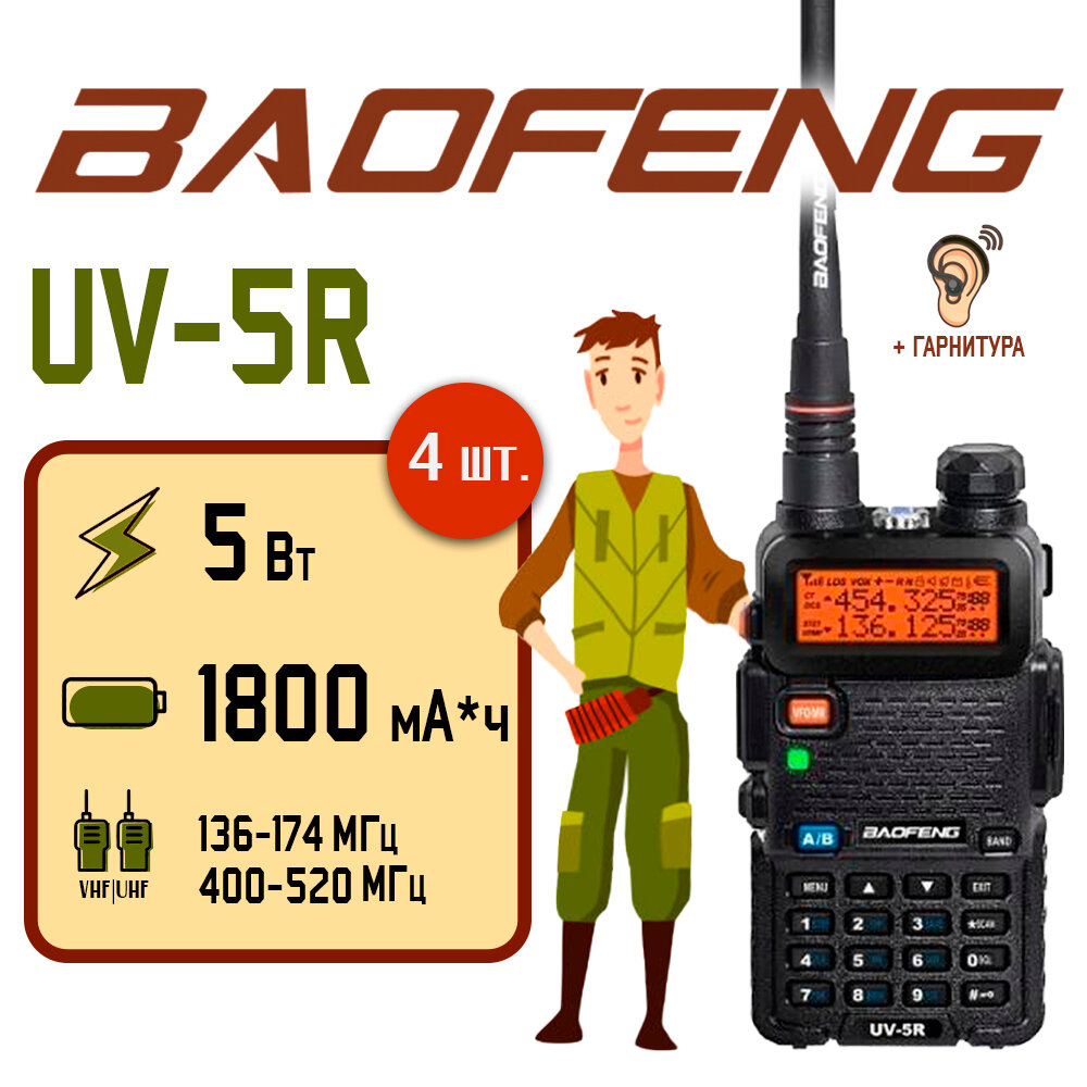 Портативная радиостанция Baofeng UV-5R / Черная комплект 4 шт. и радиусом 10 км / UHF; VHF интересное: