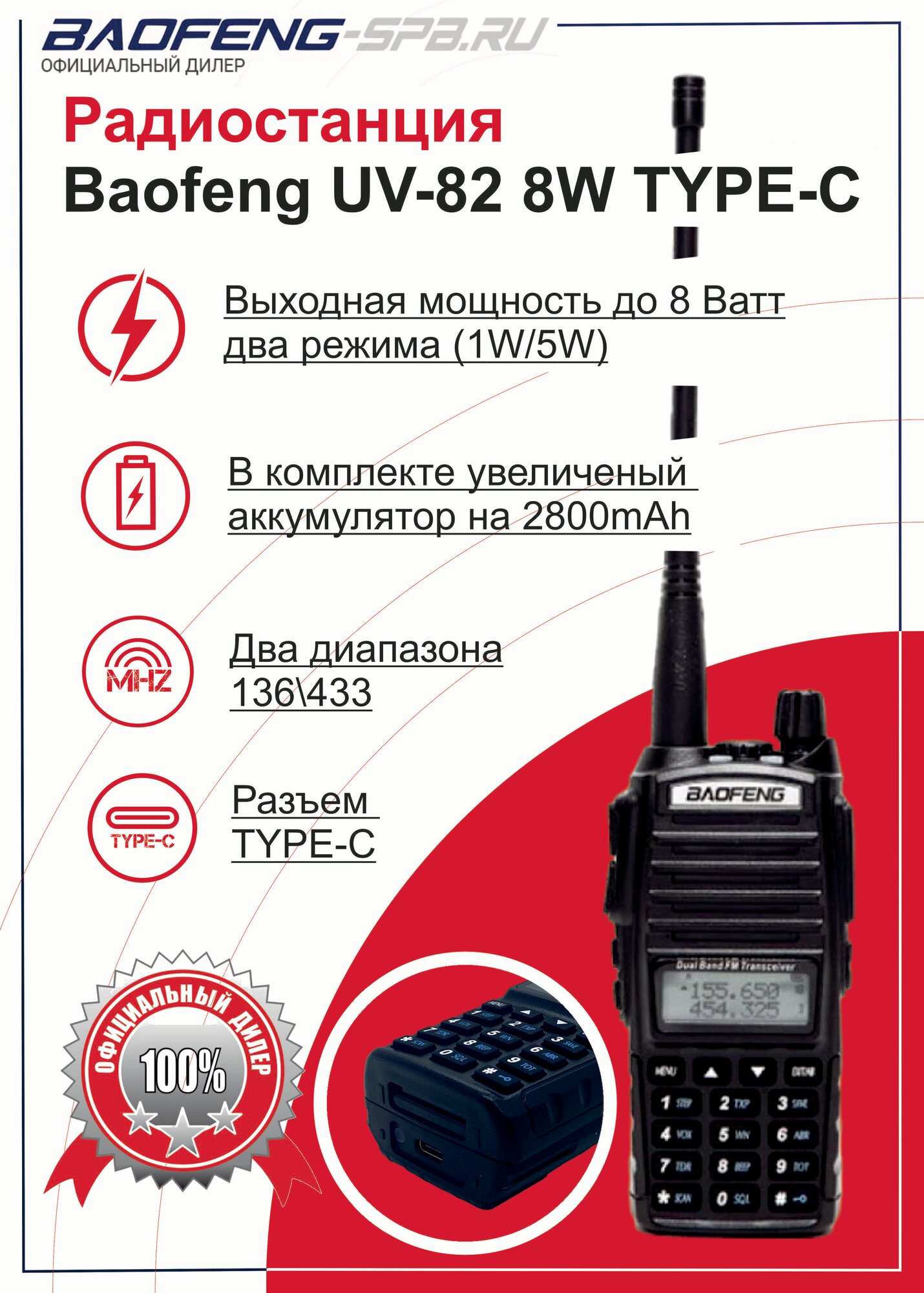Рация Baofeng UV-82 (8W) портативная, полупрофессиональная с антенной, TYPE-C
