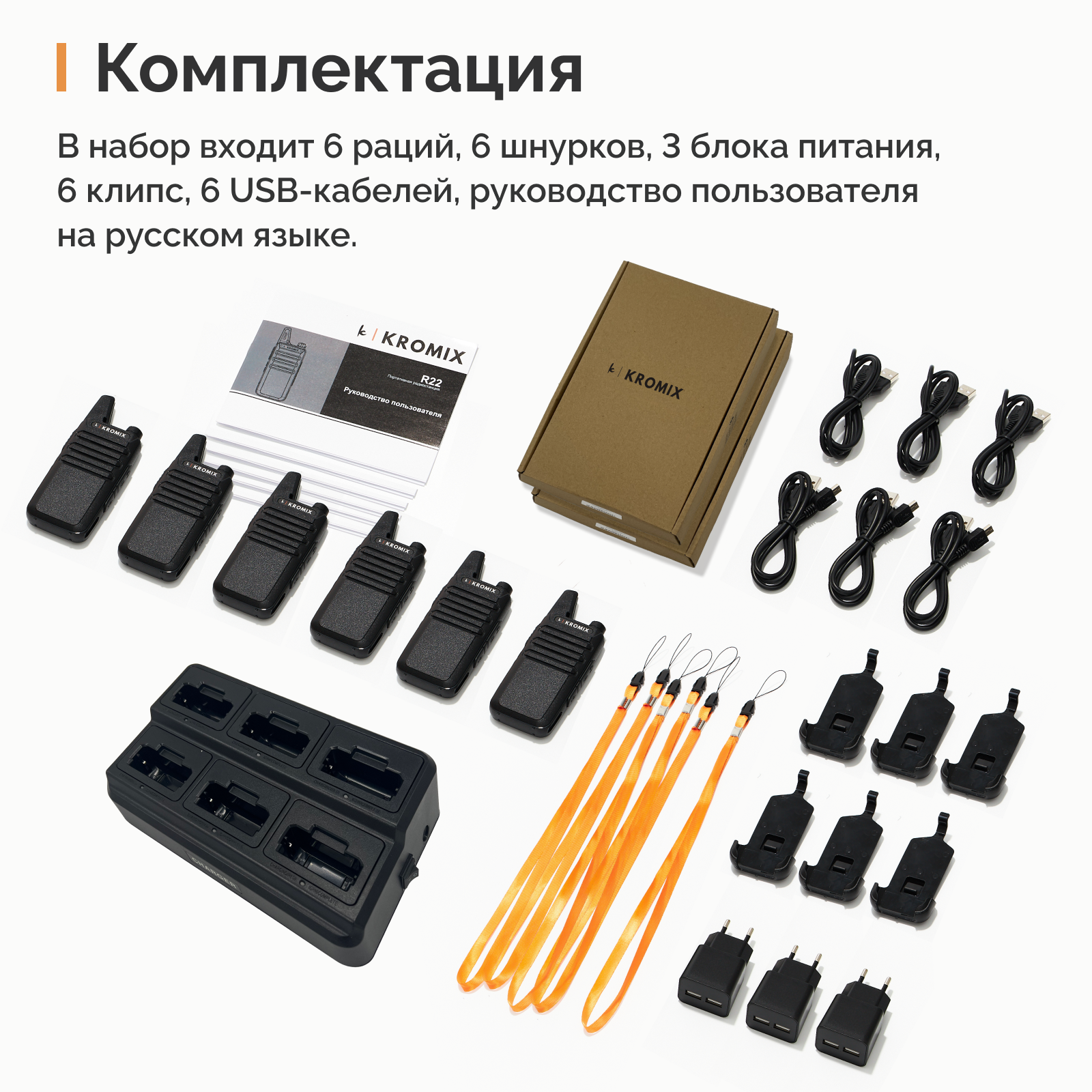 Рации KROMIX R22, комплект 6 штук, черные, с докстанцией для зарядки