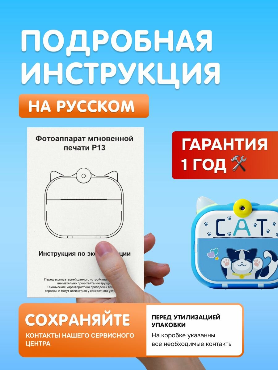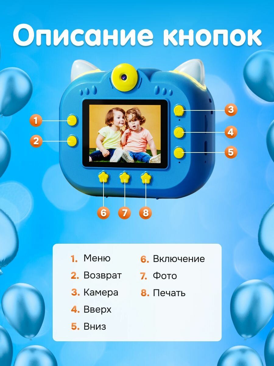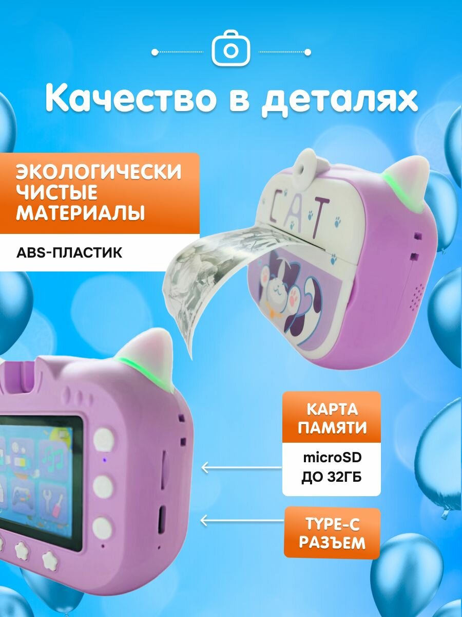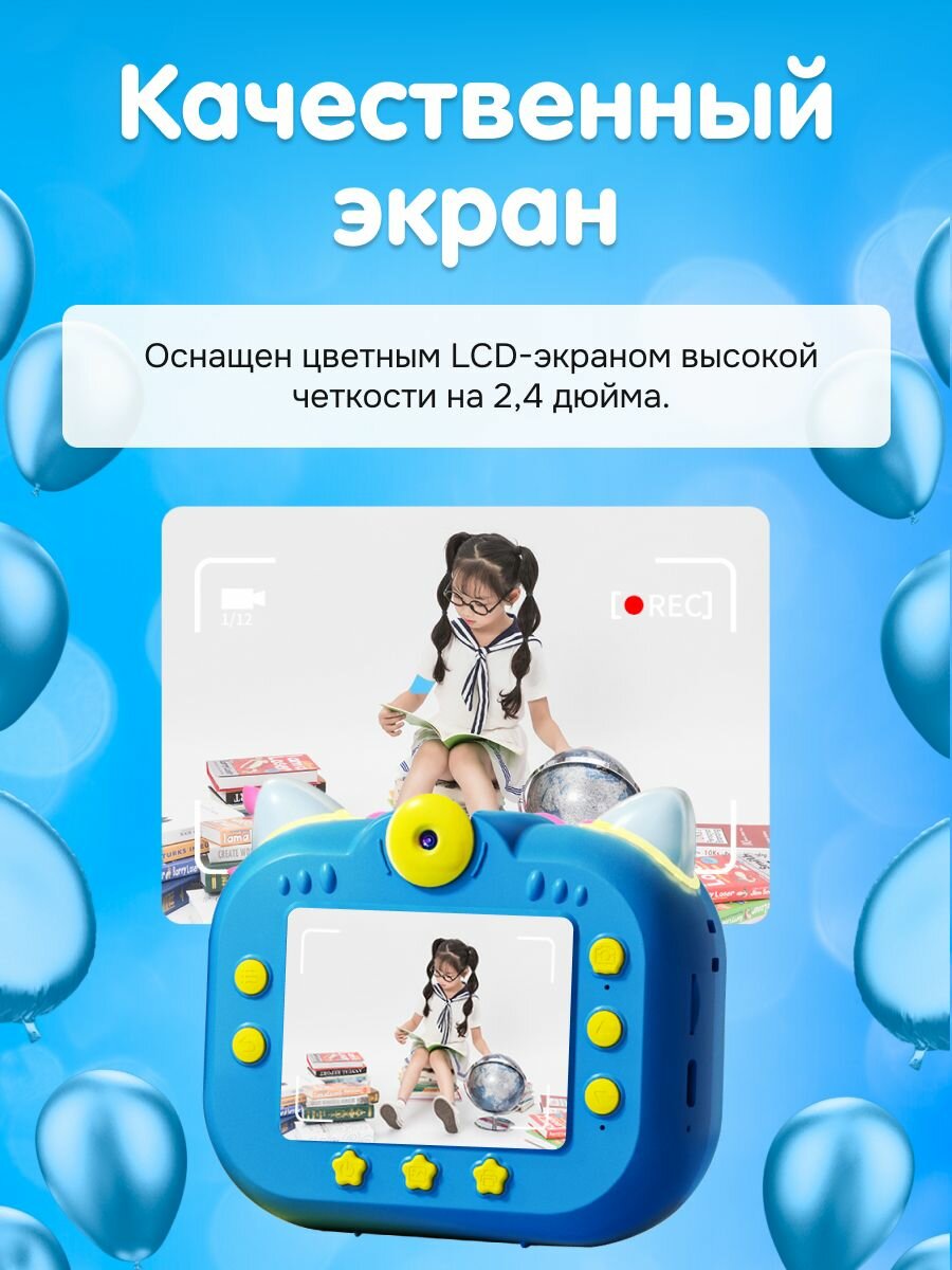 Детская камера c печатью фотографий Kid Joy, Cat Print Cam , 2,4' HD экран, 1 линза, 1000мАч , угол обзора 180 P13 русская инструкция, синяя