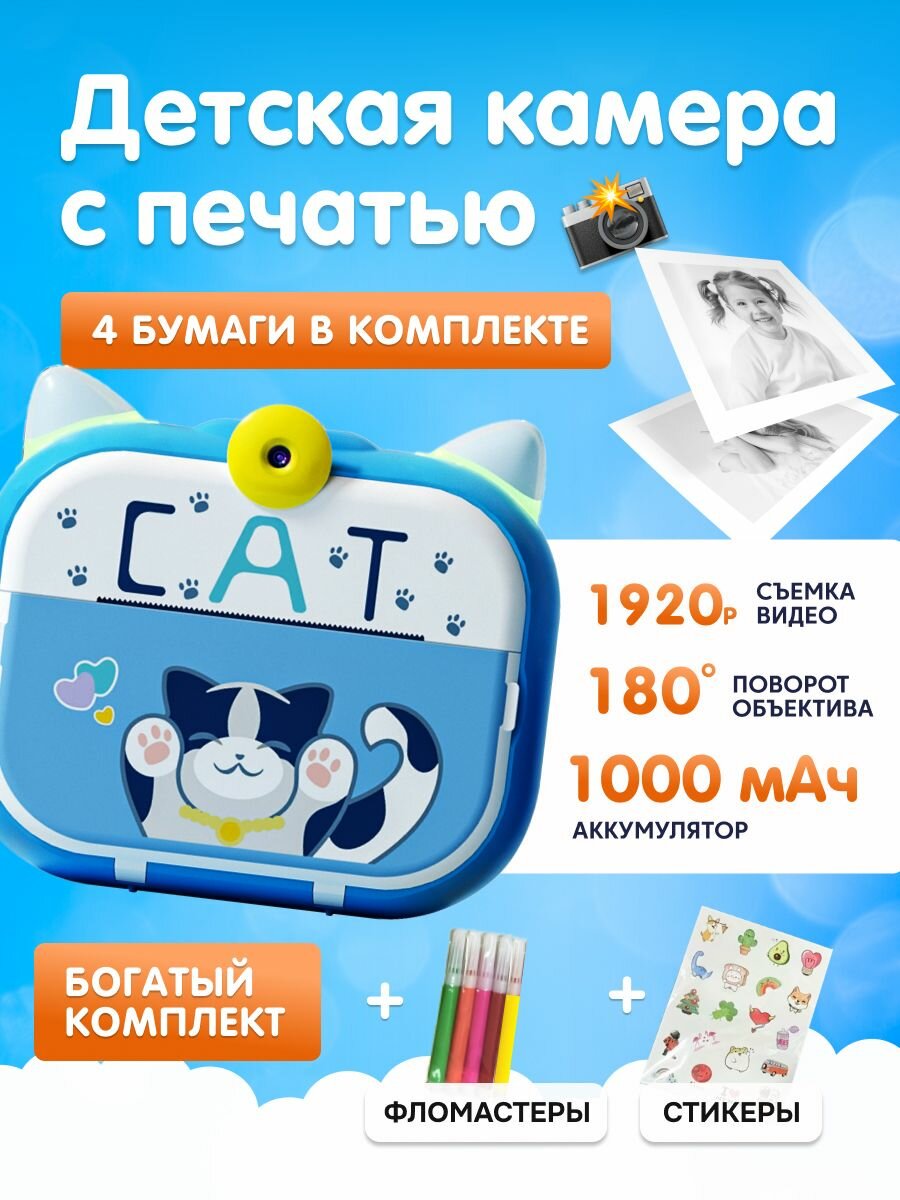Детская камера c печатью фотографий Kid Joy, Cat Print Cam , 2,4' HD экран, 1 линза, 1000мАч , угол обзора 180 P13 русская инструкция, синяя
