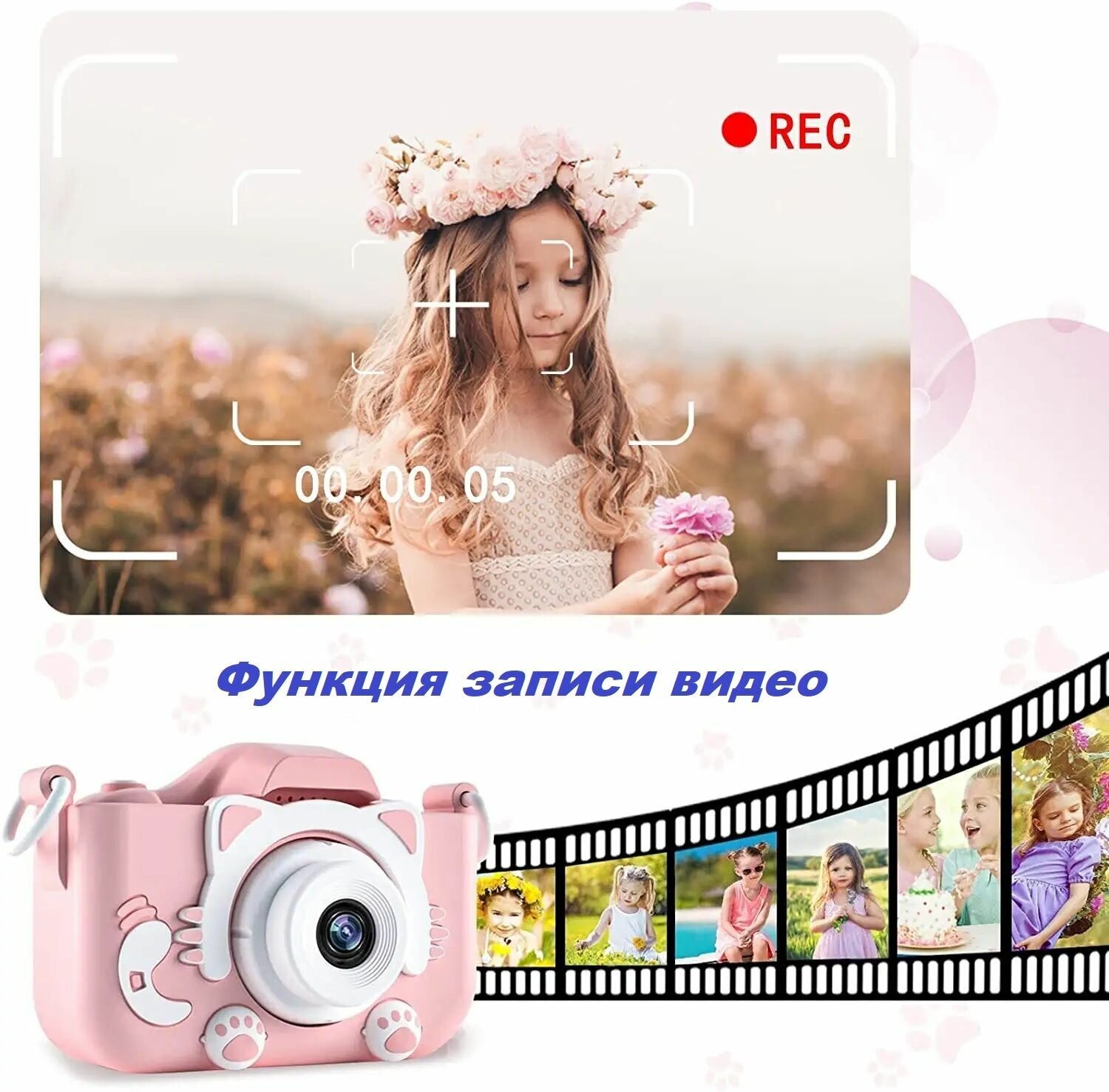 Детский фотоаппарат розовый Котик/Кошечка с селфи-камерой, играми + подарок