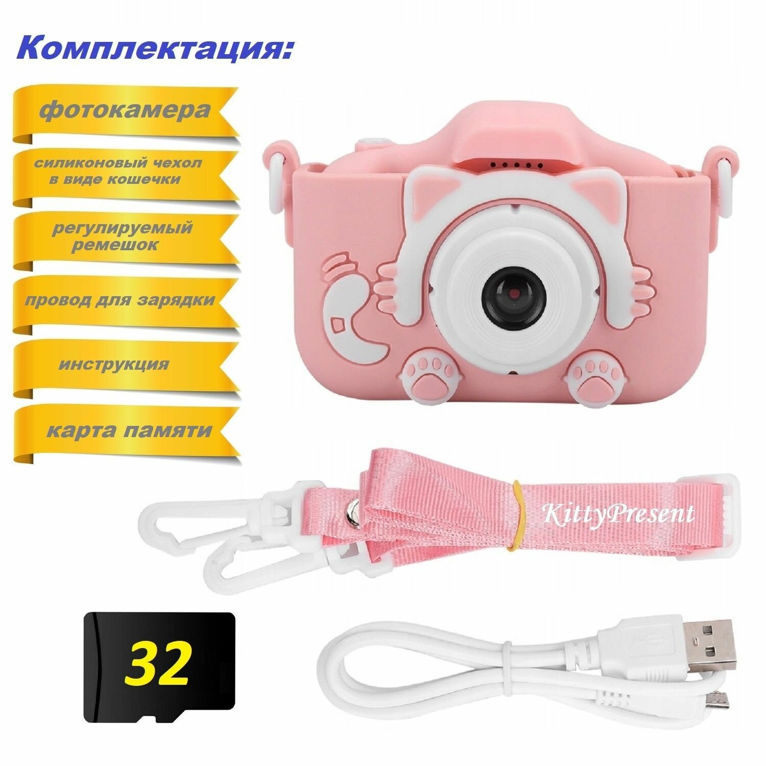 Детский фотоаппарат розовый Котик с селфи-камерой и играми + карта памяти 32 ГБ интересное: