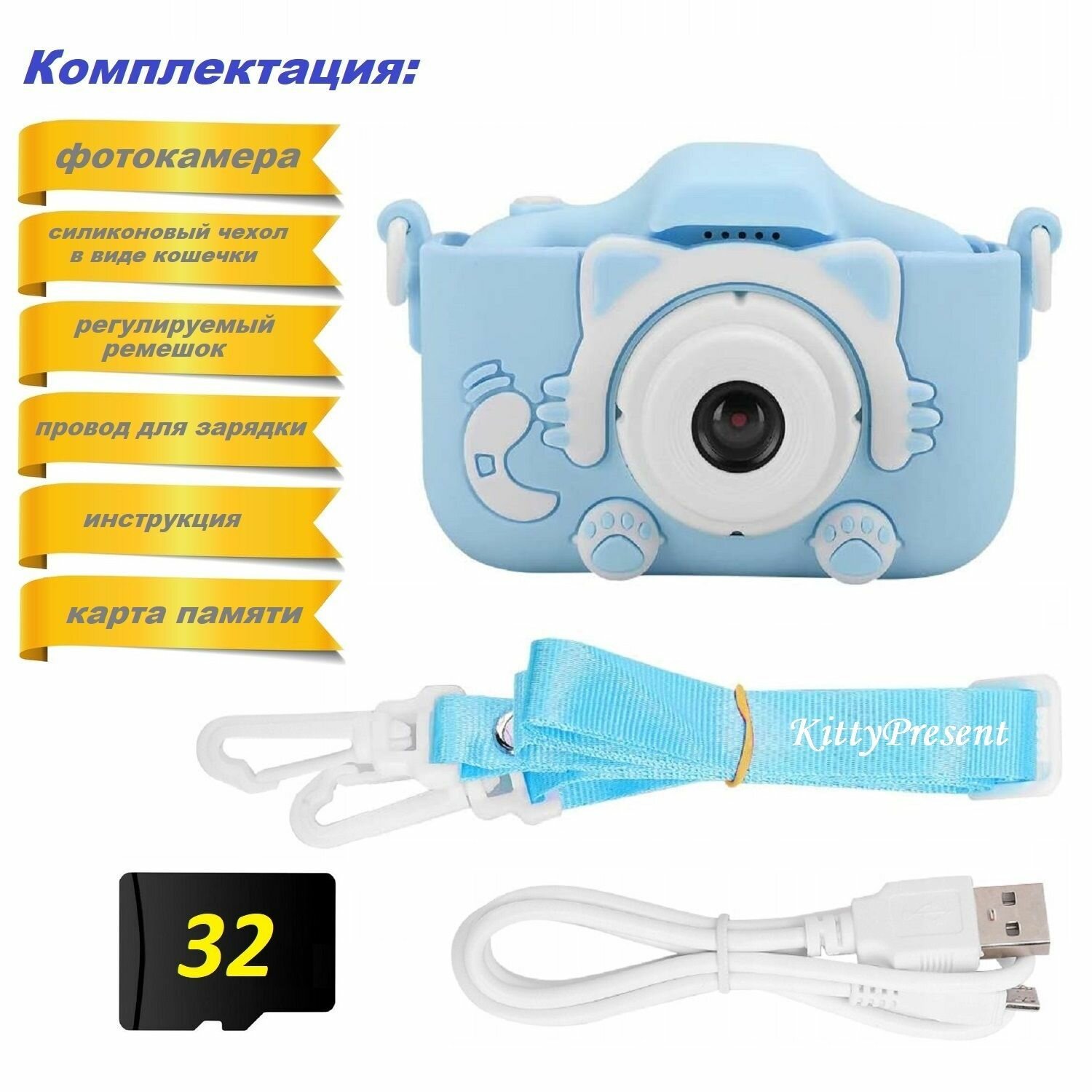 Купить Детский фотоаппарат Котик (голубой) с селфи-камерой и играми + карта памяти 32 ГБ