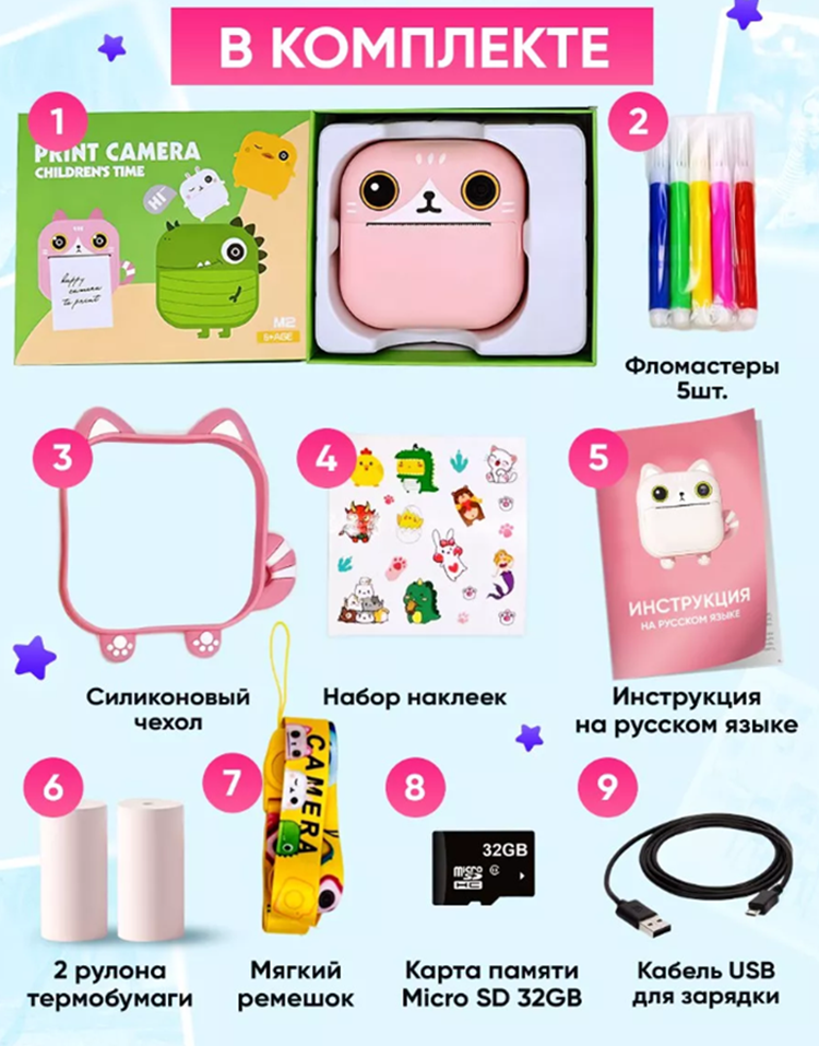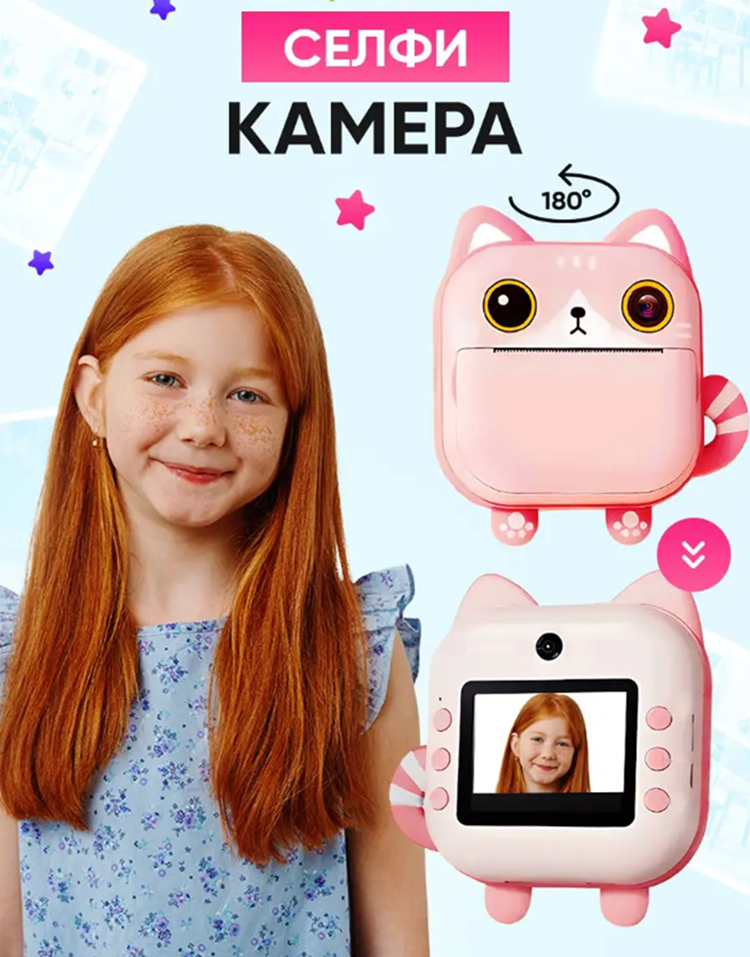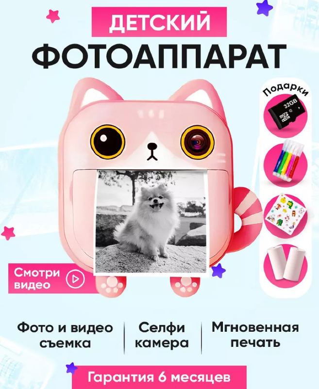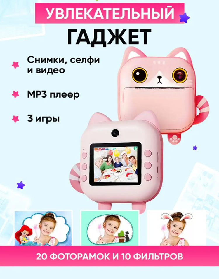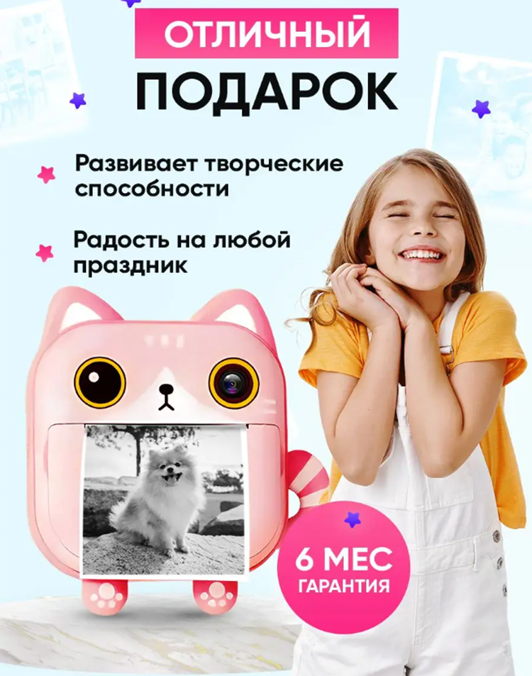 Детский фотоаппарат Print Camera с мгновенной печатью фото Котенок + карта памяти на 32GB розовый интересное: