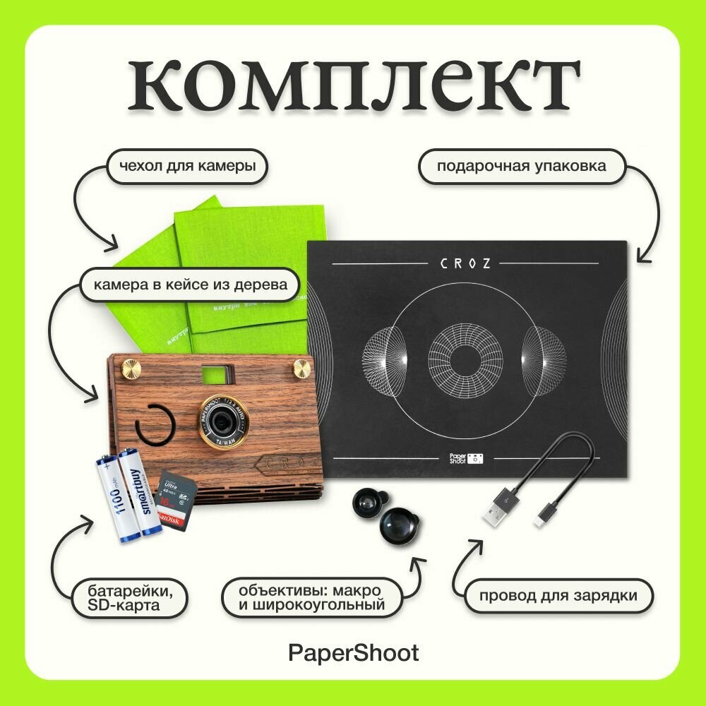 | Комплектация | В упаковке вы найдете: Материнскую плату камеры Деревянный кейс 2 крепежа (для соединения платы и кейса) Type-C кабель (для зарядки и просмотра фото) 2 объектива (макро и широкоугольный) SD-карта объемом 32 Гб, 2 ААА-батарейки |