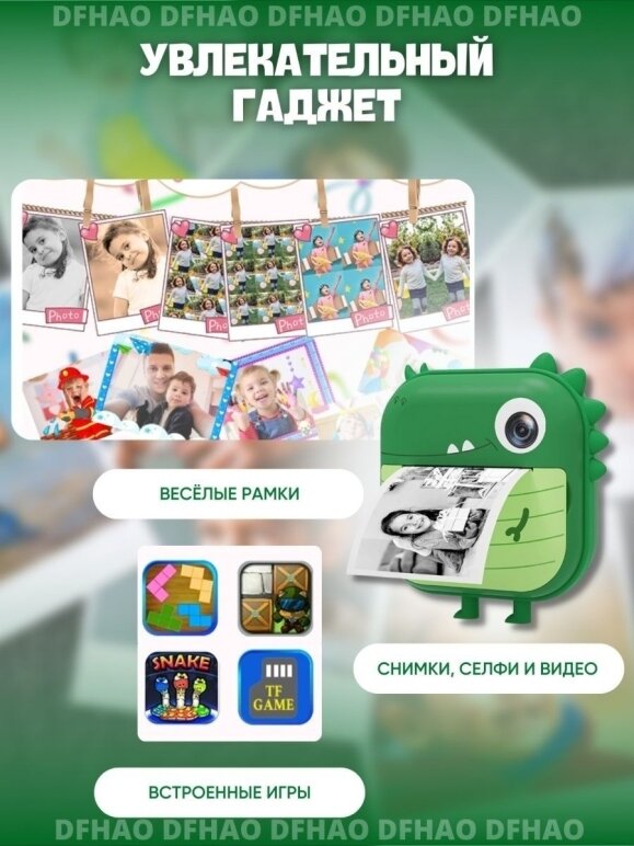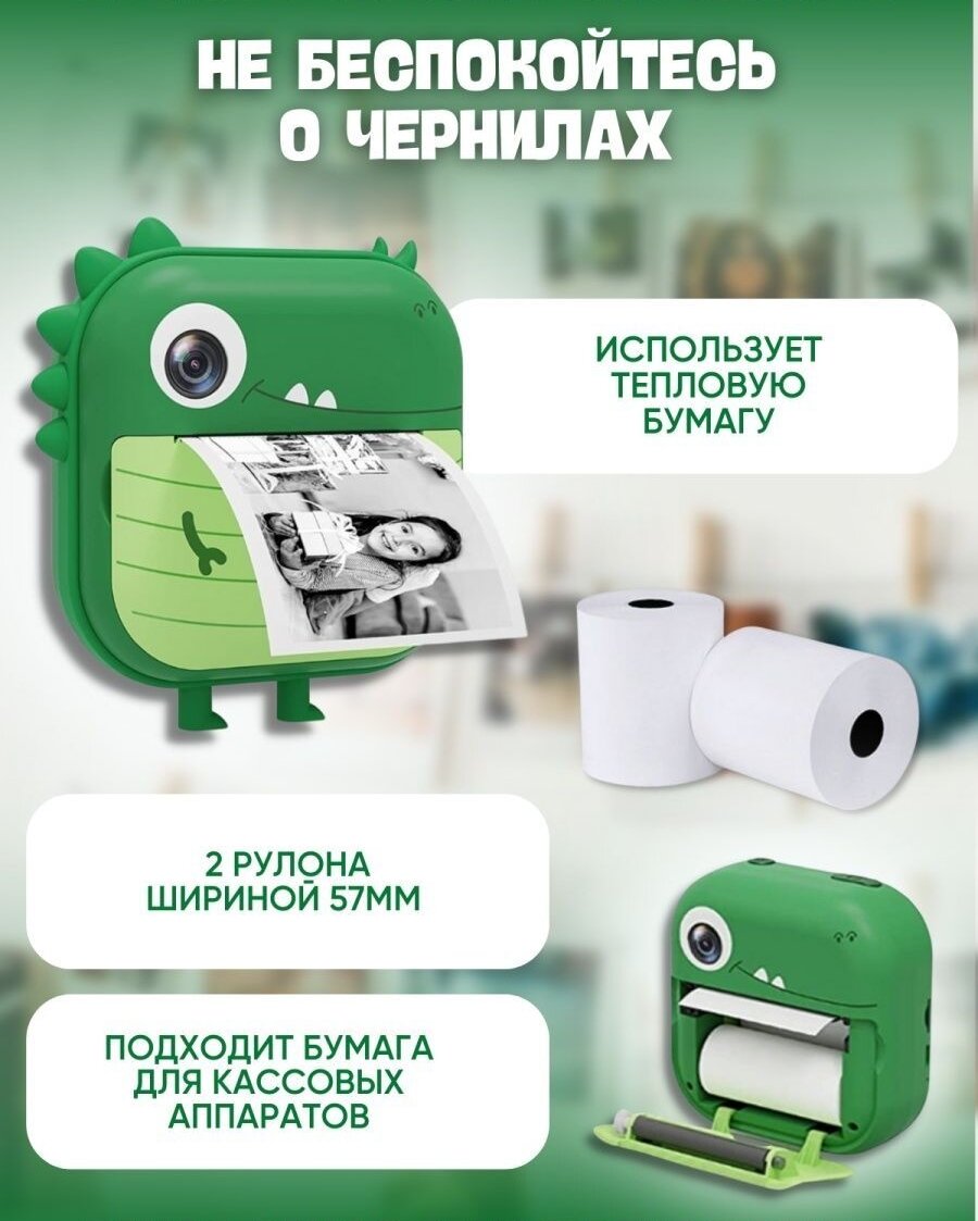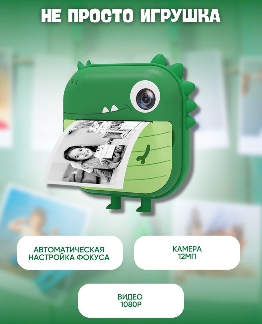 детский фотоаппарат с моментальной печатью фото Динозаврик + SD на 32GB, зеленый интересное: