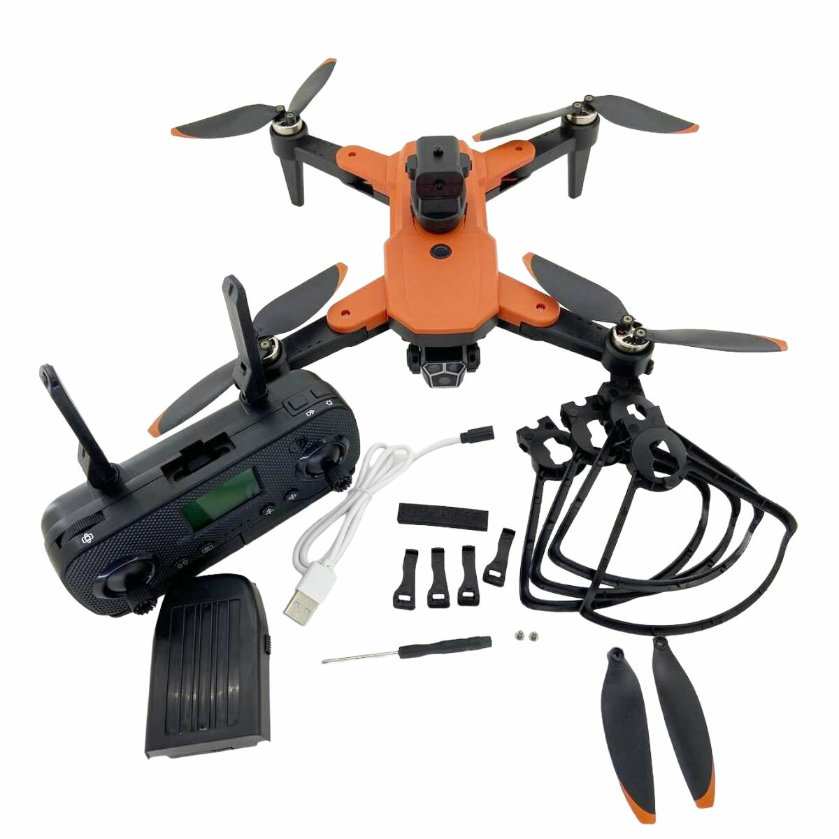 | Комплектация | Квадрокоптер с камерой (оранжевый); Аккумулятор; Пульт управления с ЖК-дисплеем; Система обнаружения препятствий; Запасные лопасти пропеллера; Защита пропеллеров; USB кабель для зарядки; Отвертка |