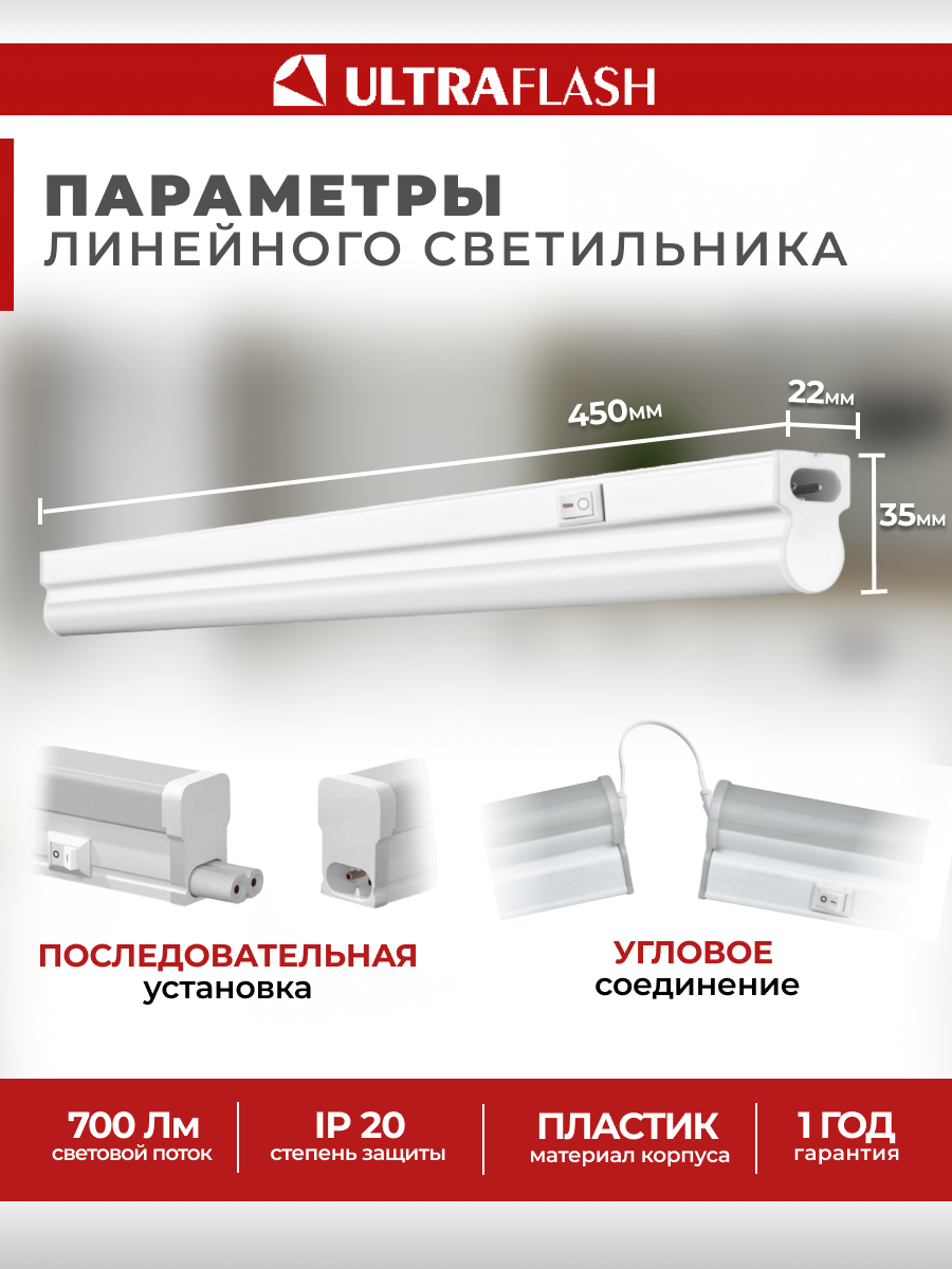 Линейный светильник Ultraflash LWL-2022-02 (Led линейный,18 Вт,4500К, с проводом и выключателем)