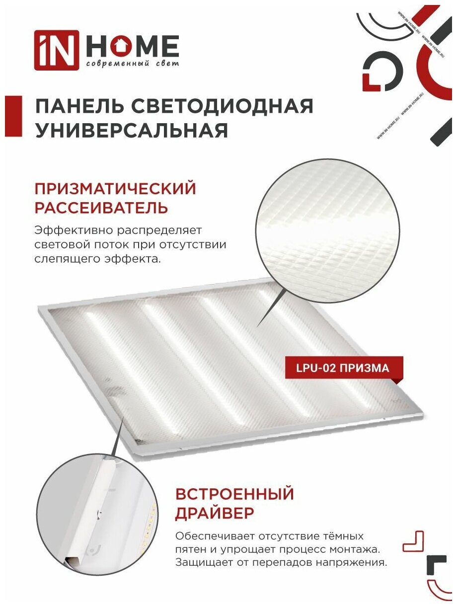 Панель светодиодная универсальная LPU-02 36Вт призма 230В 6500К 3420Лм 595х595х19мм IP40 IN HOME (4шт)