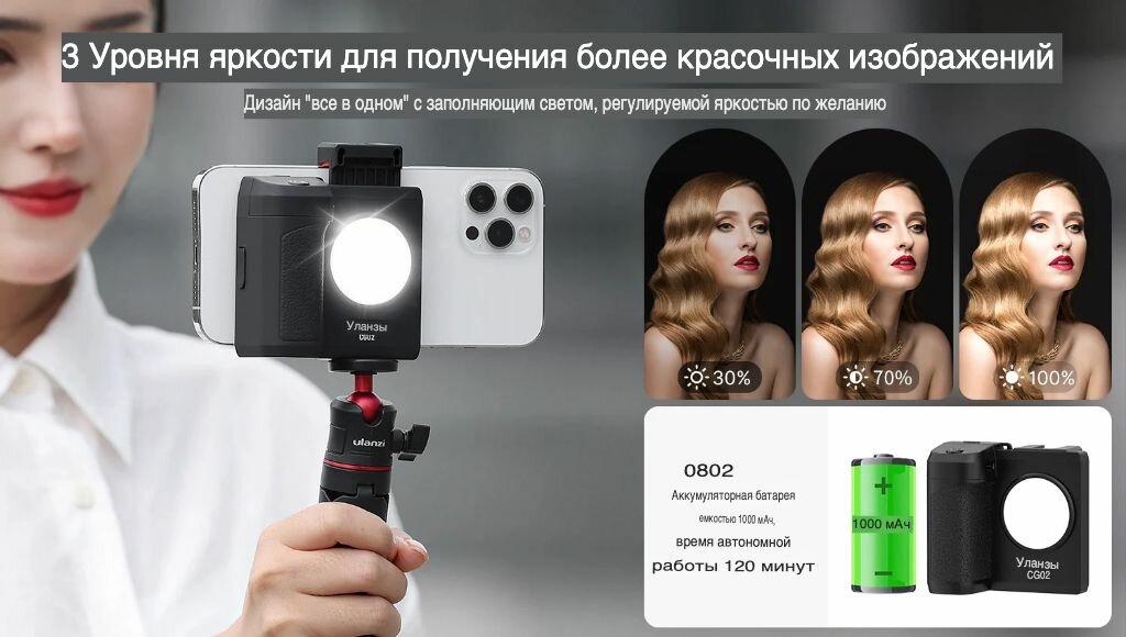 Держатель смартфона Ulanzi CapGrip 02 Bluetooth, с удаленным управлением и заполняющим светом (IOS, Android) интересное: