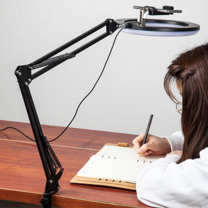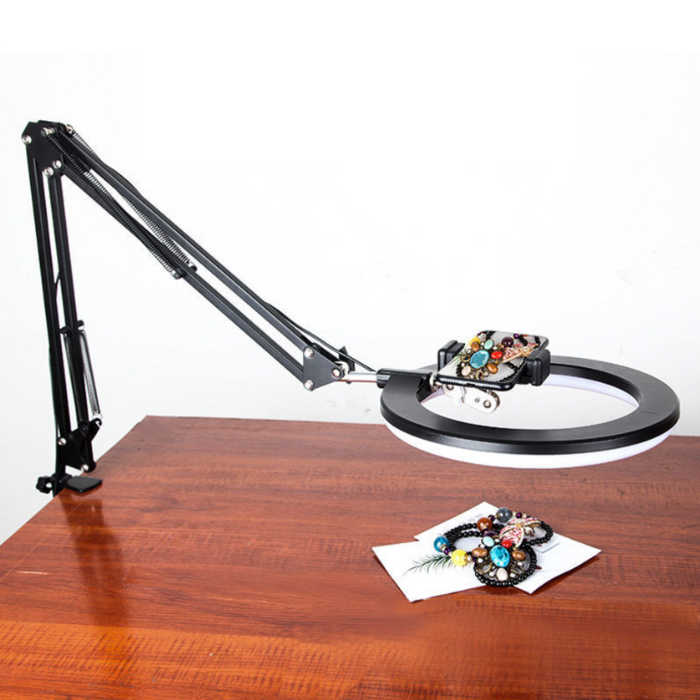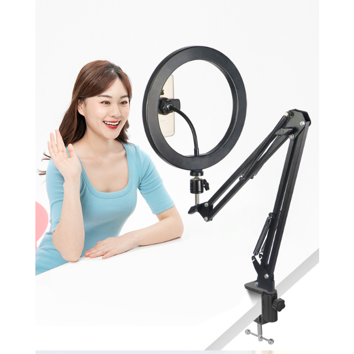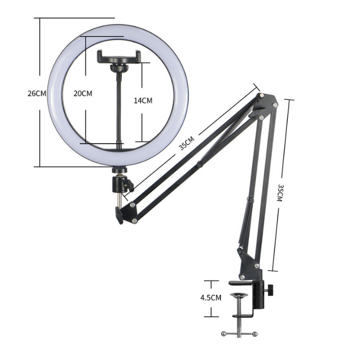 Купить Штатив настольный на струбцине для съемки сверху с подсветкой кольцевой лампой 26см и держателем для телефона