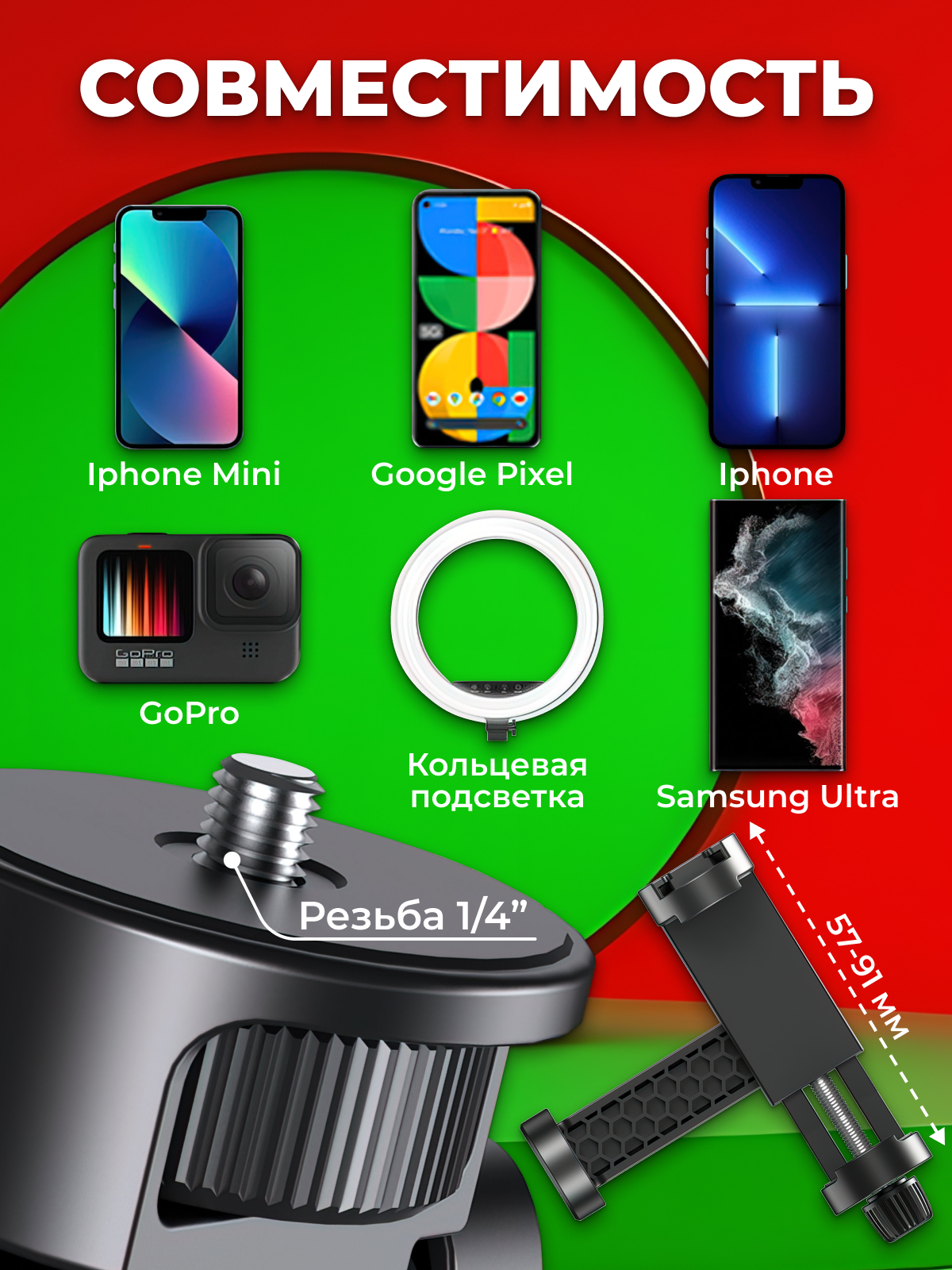 | Подходит для | телефона, универсальная, фото- и видеокамера, экшн-камера |