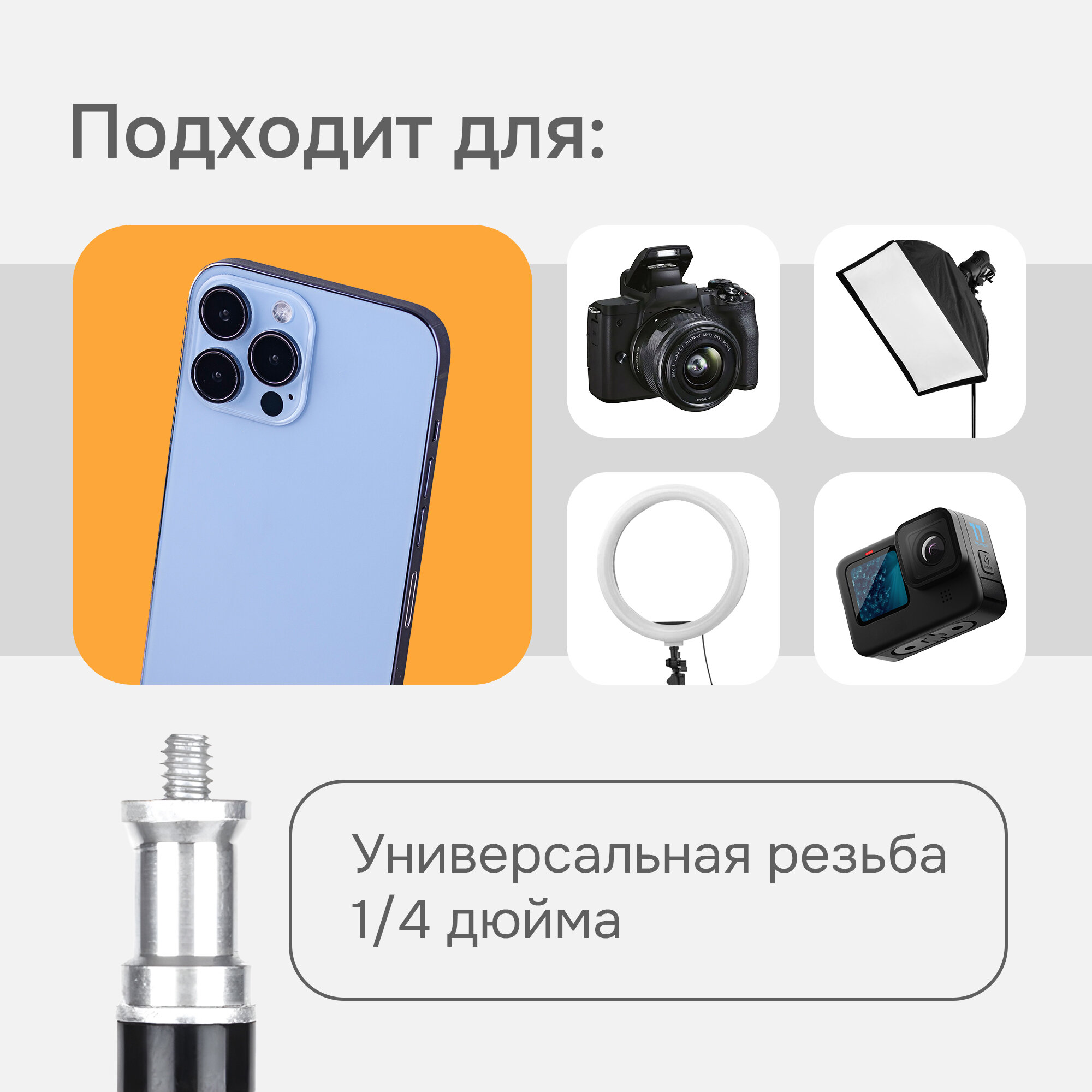 | Подходит для | телефона, универсальная, фото- и видеокамера, экшн-камера |