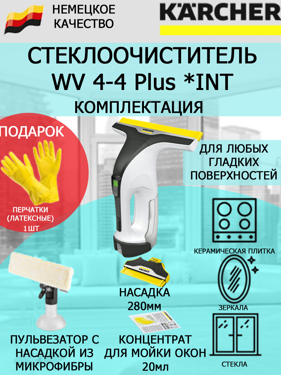 Стеклоочиститель Karcher WV 4-4 Plus INT+латексные перчатки интересное:
