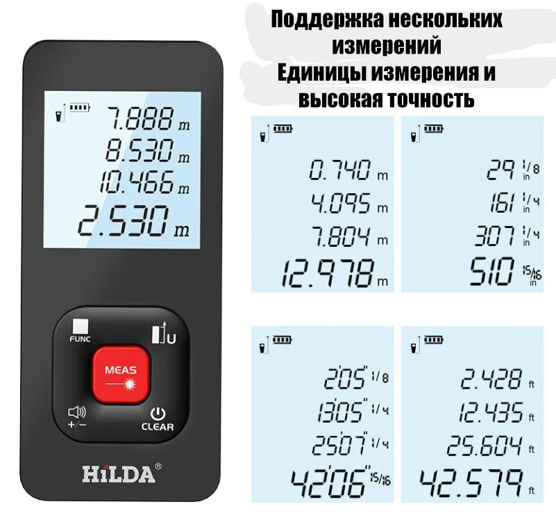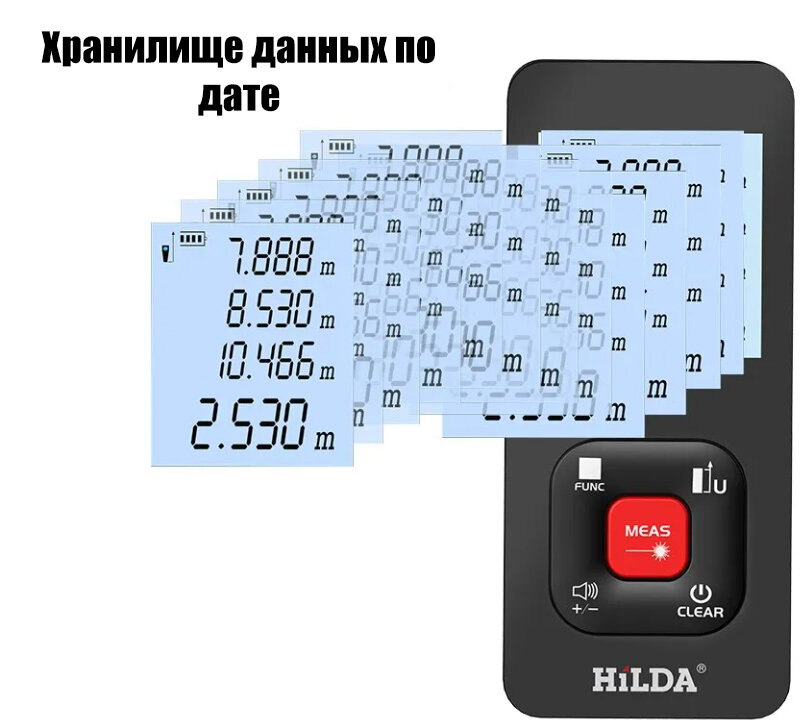 | Функции и особенности | USB-порт, автоматическое отключение, встроенная память, звуковая индикация, подсветка дисплея, функция непрерывного измерения, функция расчета объема, функция расчета площади, функция сложения/вычитания |