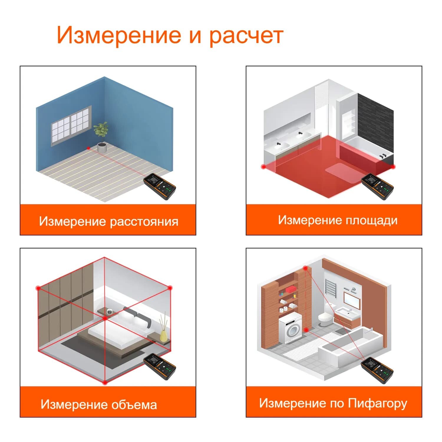 | Функции и особенности | автоматическое отключение, встроенная память, звуковая индикация, определение мин. и макс. значений, функция Пифагора, функция непрерывного измерения, функция расчета объема, функция расчета площади, функция сложения/вычитания |