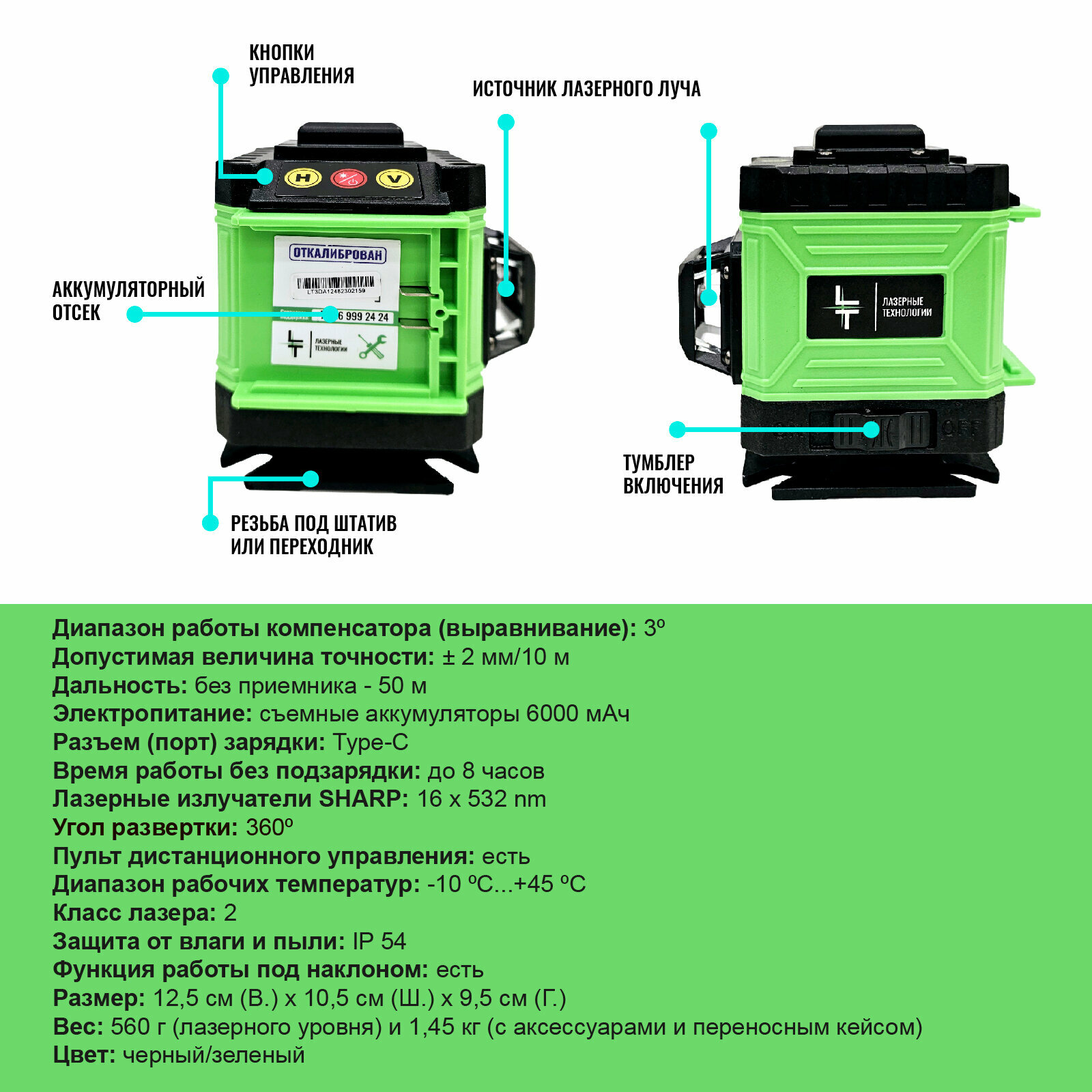 Профессиональный Лазерный уровень (нивелир) LT L16-360A 4D 16 линий.