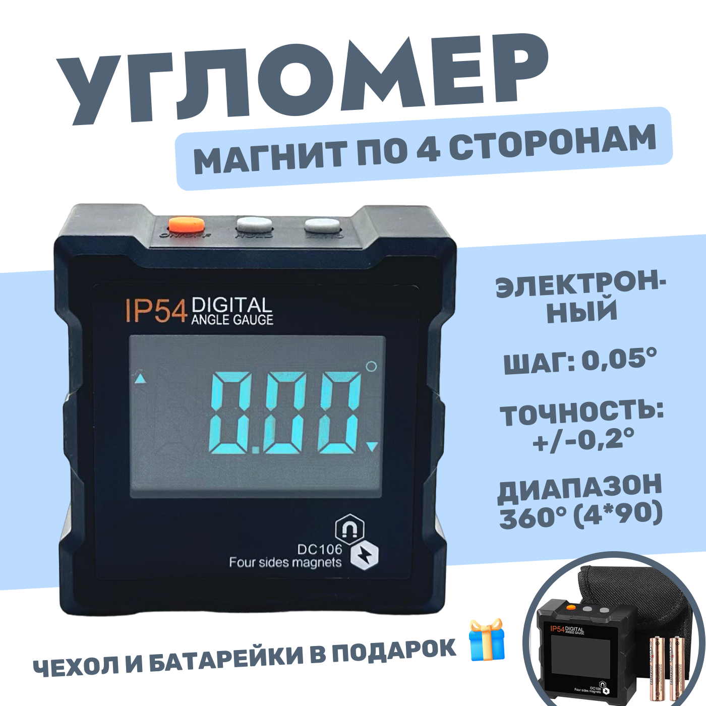 | Подробная комплектация | Угломер, чехол для хранения, 2 батарейки ААА |