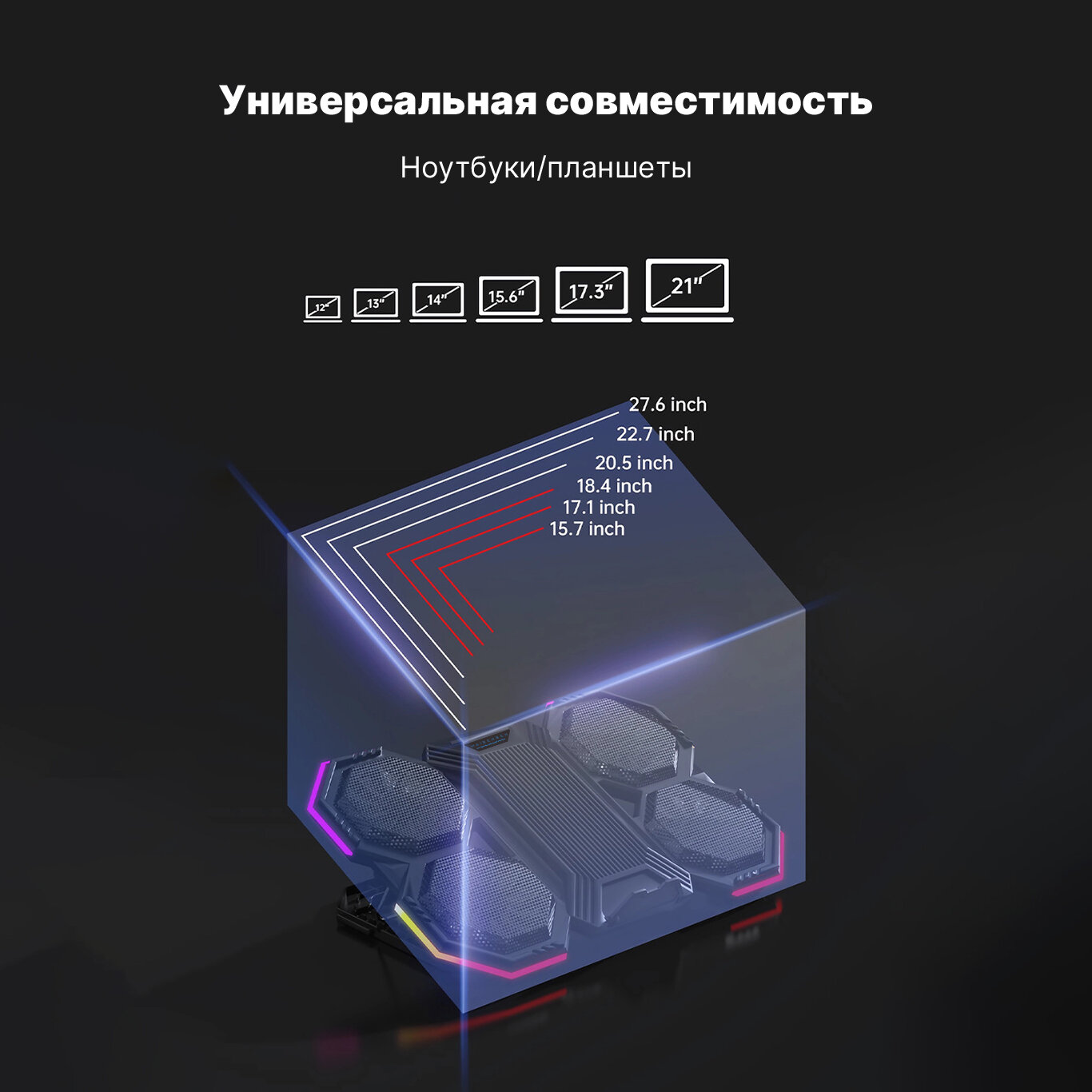 Регулируемая охлаждающая подставка для ноутбуков, 2 вентилятора, подсветка, 5 углов наклона, держатель для смартфона, 2 USB , для экрана 13"-19"