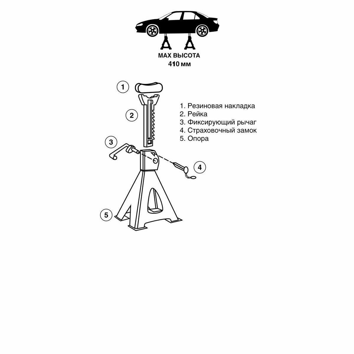 | Дополнительная информация | Подставки предназначены для удержания и страховки автомобиля при проведении ремонтных работ. Снабжены дополнительным страховочным замком для большей безопасности. Увеличенные опорные площадки для лучшей устойчивости и предотвращения повреждений напольного покрытия. Устанавливайте подставку только на ровную и твердую поверхность Убедитесь, что нагрузка приходится на центр площадки страховочной подставки |