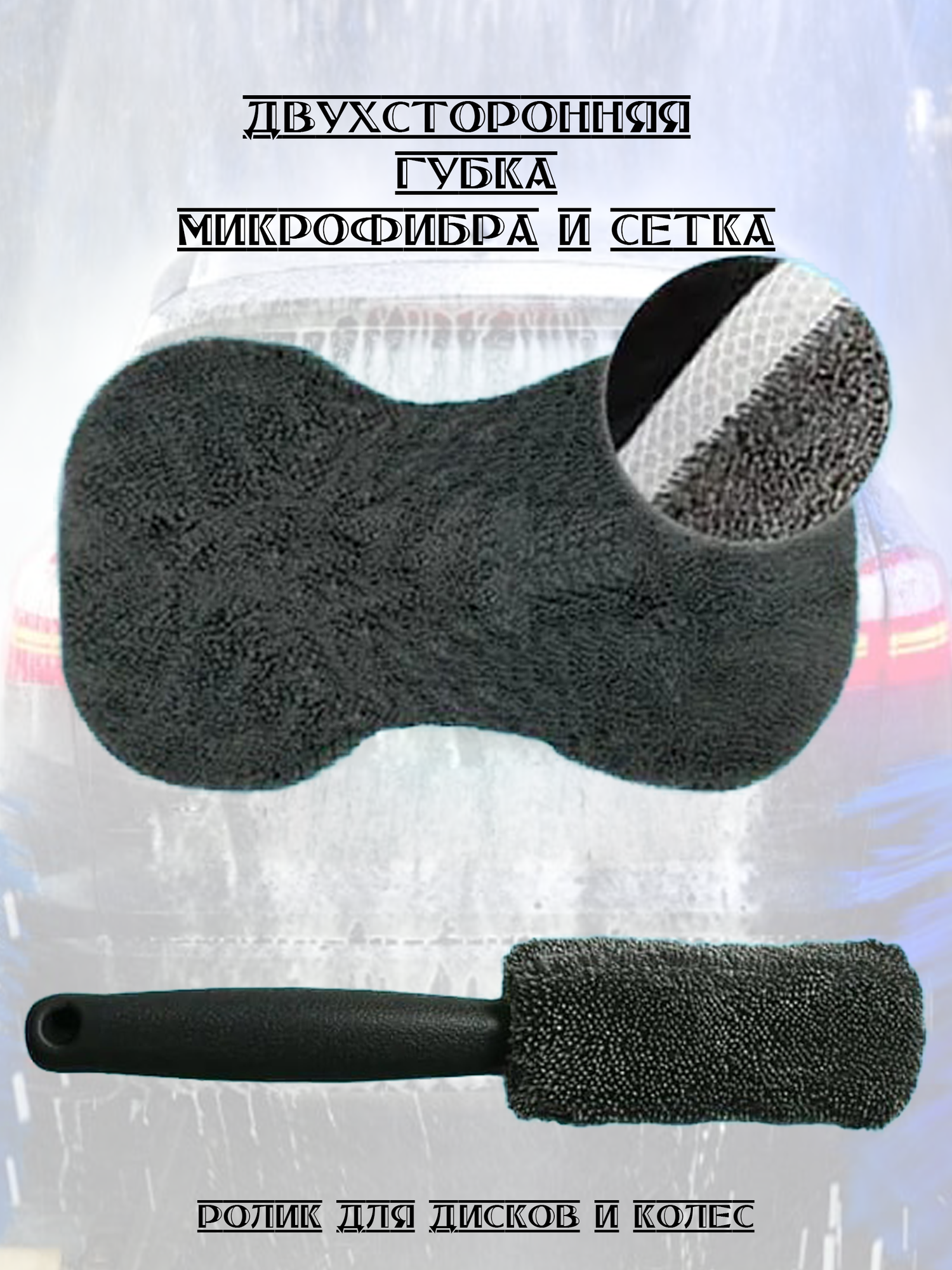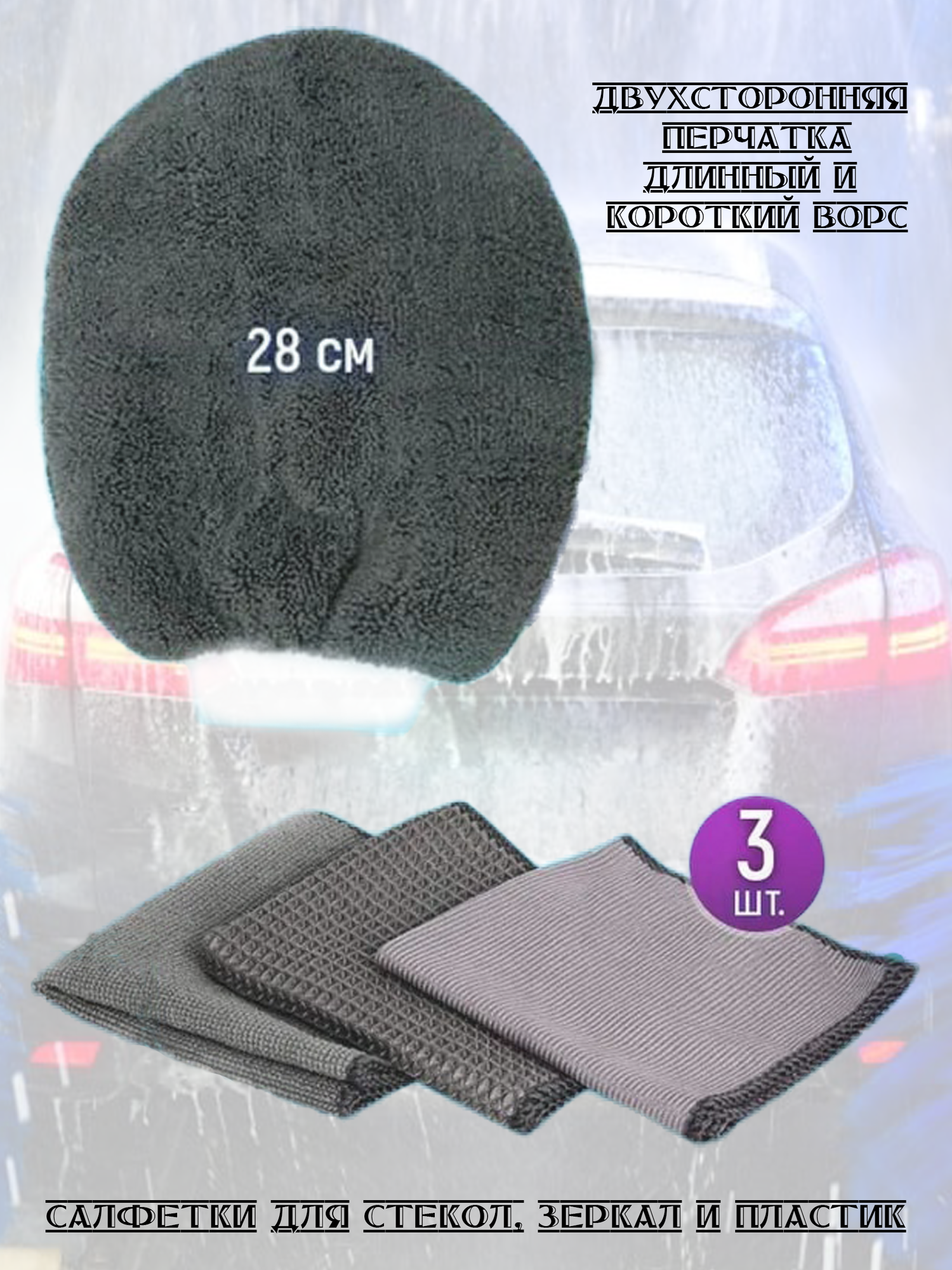 | Подробная комплектация | двухсторонняя варежка для мойки авто, губка двухсторонняя, ролик с ручкой для чистки колесных дисков и шин, 3 диска для полировки автомобиля, полотенца из микрофибры. |