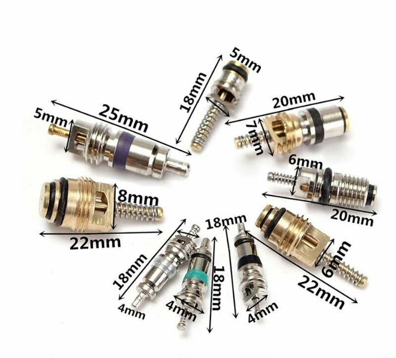 Набор ниппелей (золотников) 100 шт, 9 видов, для сервисных заправочных портов автомобильных кондиционеров и авторефрижераторов.