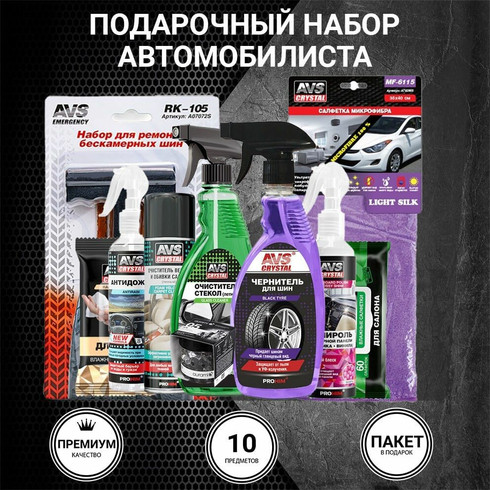 | Подробная комплектация | антидождь, пенный очиститель салона, очиститель стёкол, полироль приборной панели, чернитель шин, набор для ремонта шин, салфетка микрофибра, салфетки для салона, салфетки для рук, ароматизатор гелевый, крафт пакет |