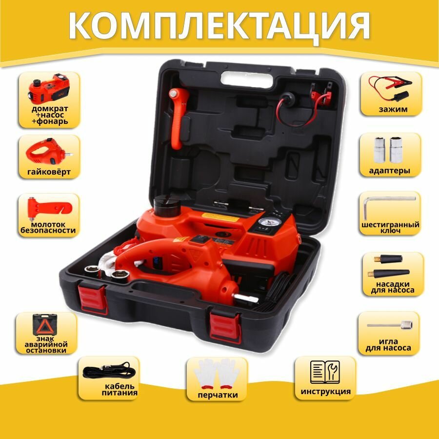 Купить Автокомплект 5 в 1 - набор автомобилиста электрический гидравлический домкрат, фонарь, гайковёрт, насос и знак аварийной остановки