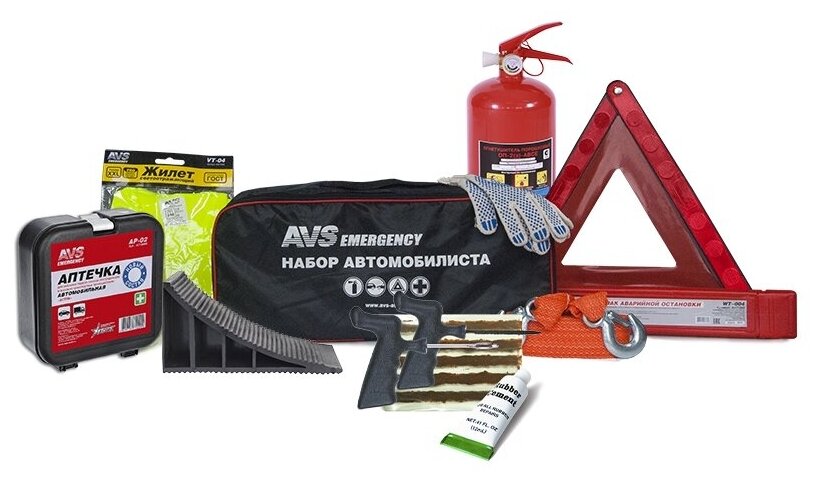 | Подробная комплектация | 1. Жилет светоотражающий VT-05 (70гр/м2) XL (РОССИЯ) 2. Аптечка автомобильная (по приказу) AVS AP-02 (Комплектация аптечки соответствует приказу № 1080н от 08.10.2020 Министерства здравоохранения Российской Федерации) 3. Знак аварийной остановки модель AVS WT-004 4. Трос буксировочный с крюками AVS ET-5S, 5 тонн, 4.5 м, в пакете 5. Перчатки ХБ с ПВХ (белые) 7,5 класс 1 пара AVS RP-01 6. Упор (башмак) противооткатный AVS SM-01 7. Набор для ремонта бескамерных шин AVS RK-110 (8 предм.) 8. Сумка "Набор автомобилиста" AVS SN-01 9. Огнетушитель ОП-2 (ABCE) (Ярпожинвест) |