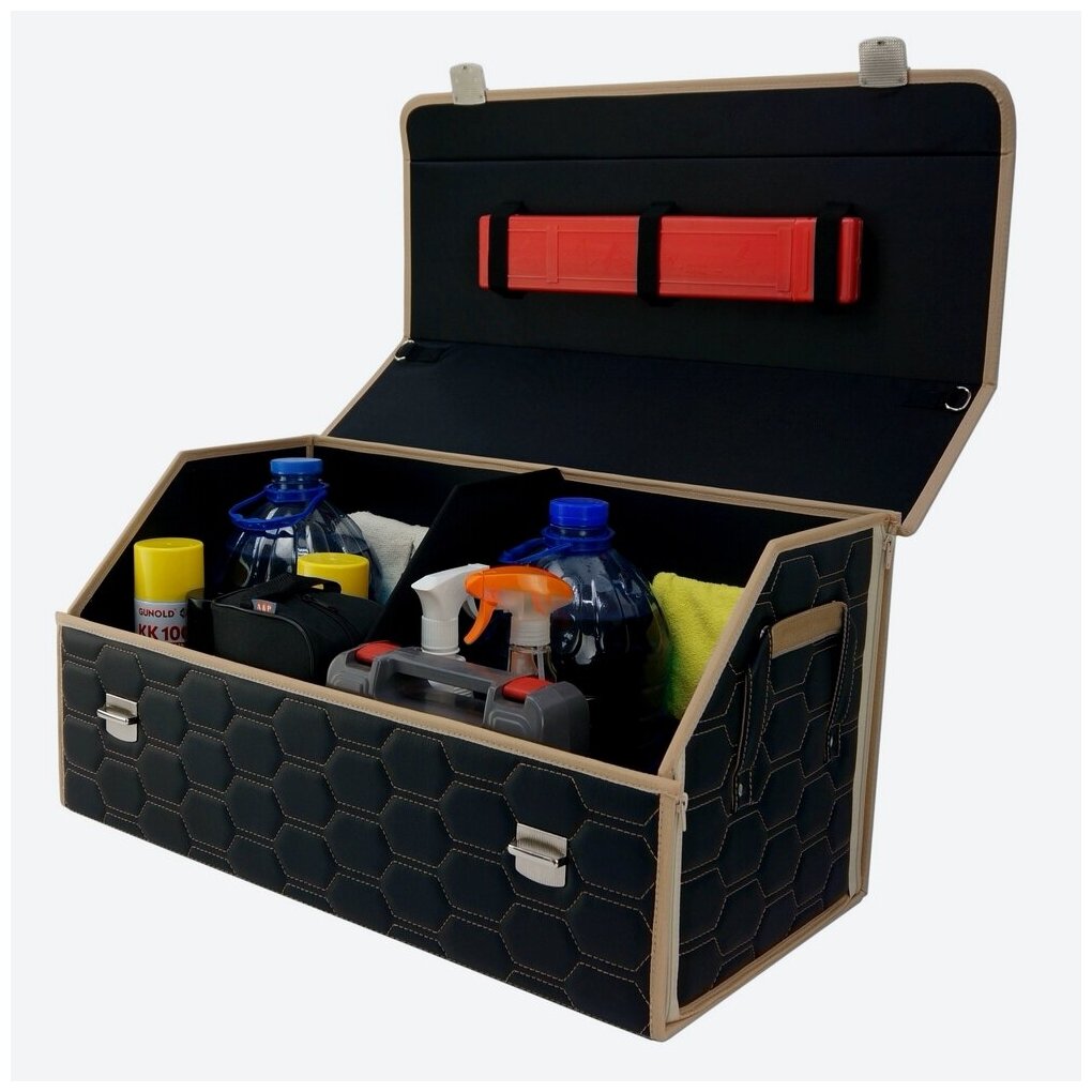 Органайзер-саквояж в багажник "Союз Премиум" (размер XL). Цвет: черный с бежевой прострочкой Соты и вышивкой LADA (лада).