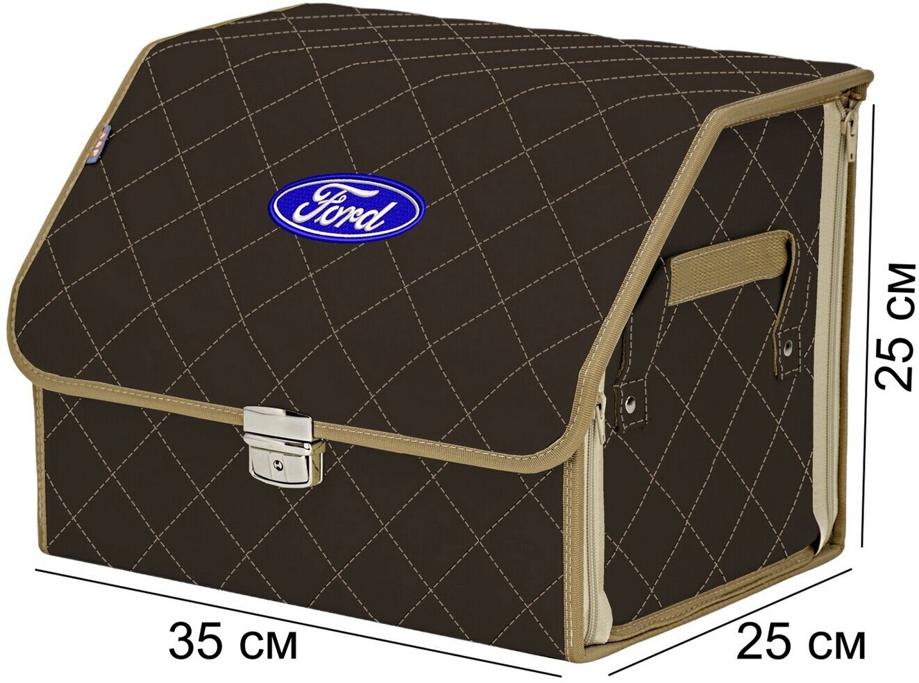 Органайзер-саквояж в багажник "Союз Премиум" (размер L). Цвет: коричневый с бежевой прострочкой Ромб и вышивкой Ford (Форд).