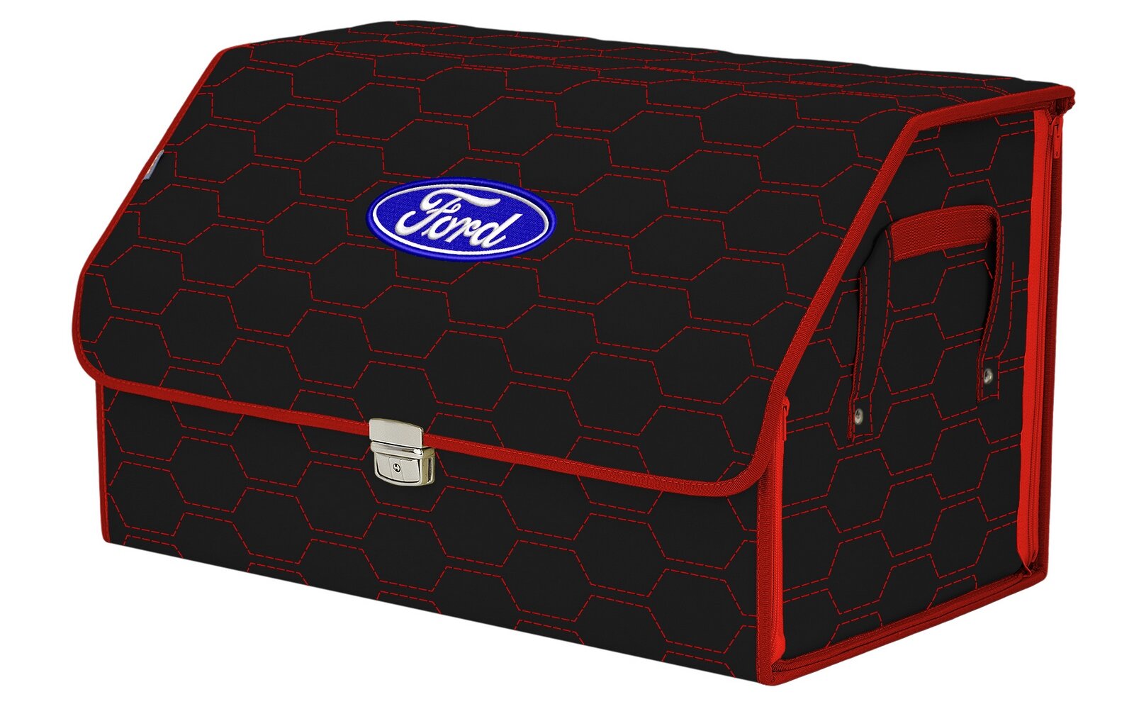 Органайзер-саквояж в багажник "Союз Премиум" (размер XL Plus). Цвет: черный с красной прострочкой Соты и вышивкой Ford (Форд).