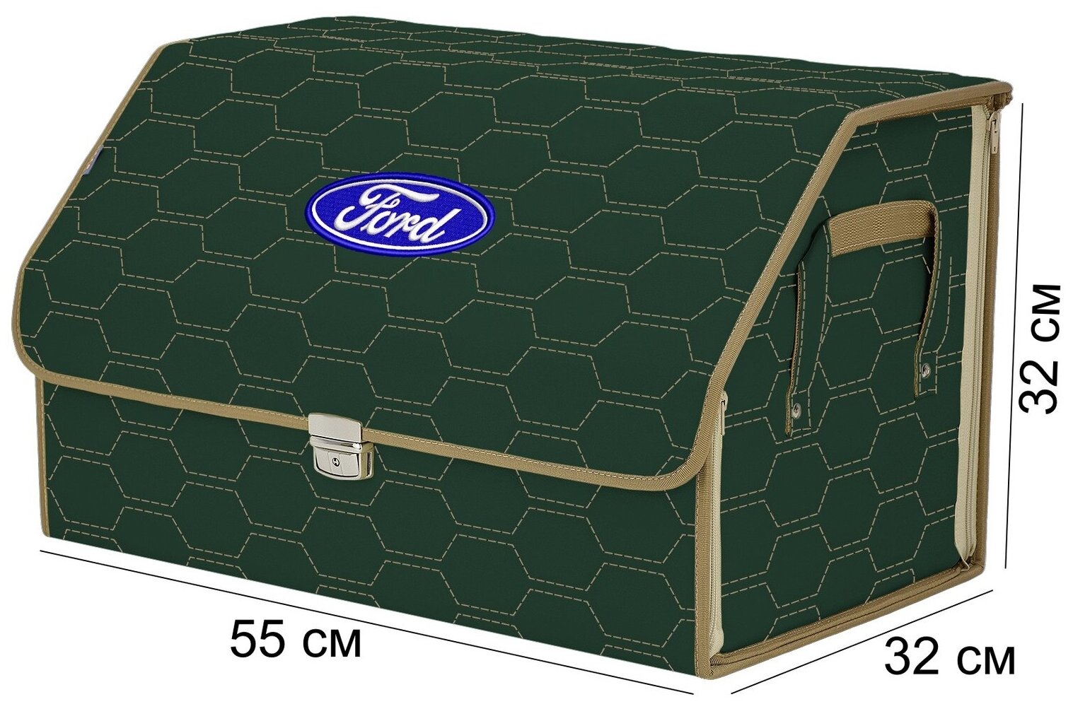 СохранитьОрганайзер-саквояж в багажник "Союз Премиум" (размер XL). Цвет: зеленый с бежевой прострочкой Соты и вышивкой Ford (Форд). интересное:
