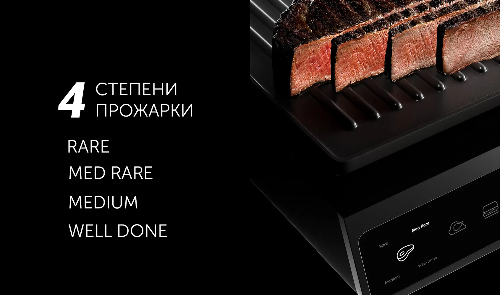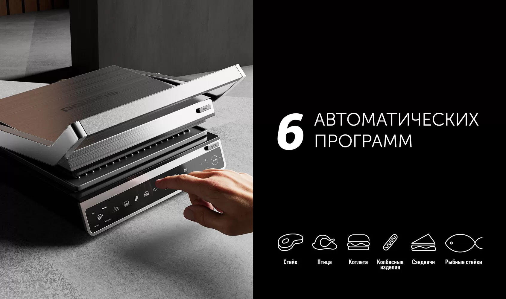 | Дополнительная информация | автоматическое определение толщины продукта; 6 автоматических программ; 4 степени прожарки: rare, med rare, medium, well done |