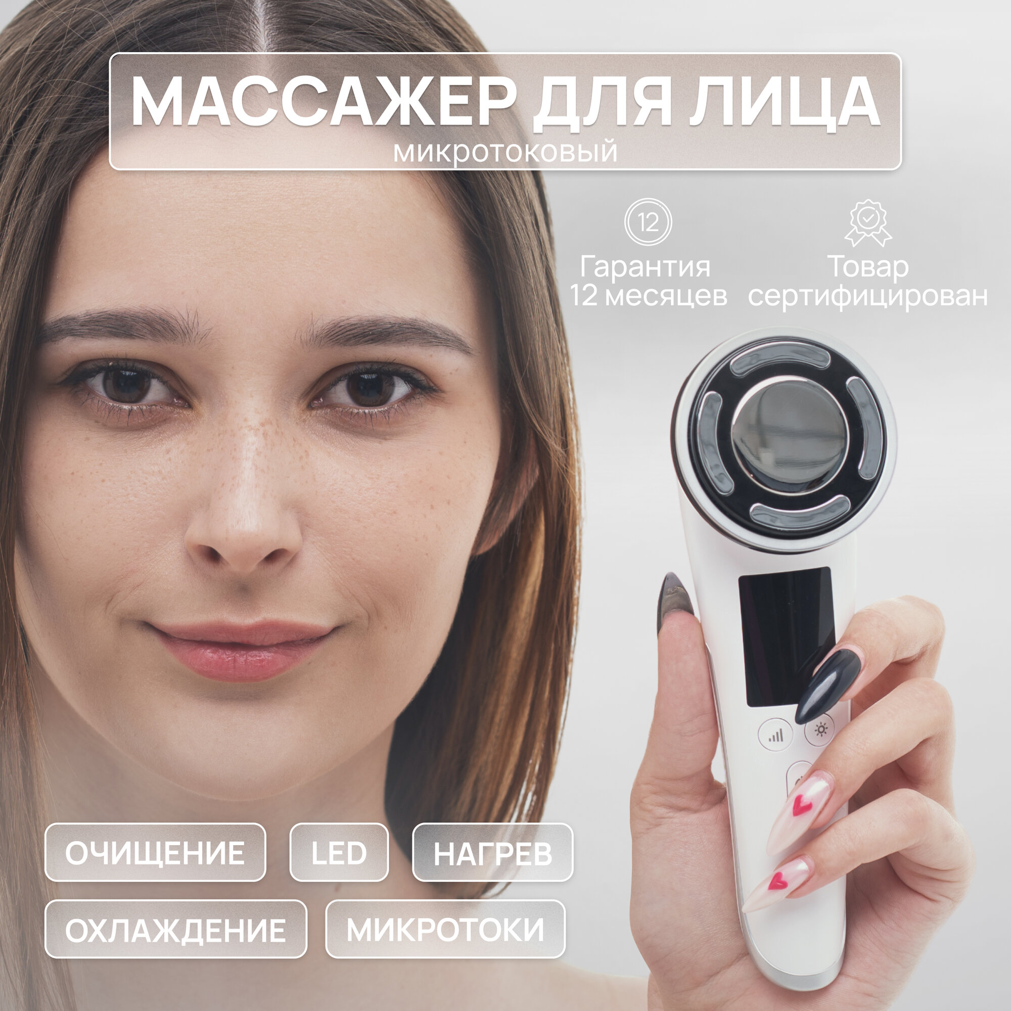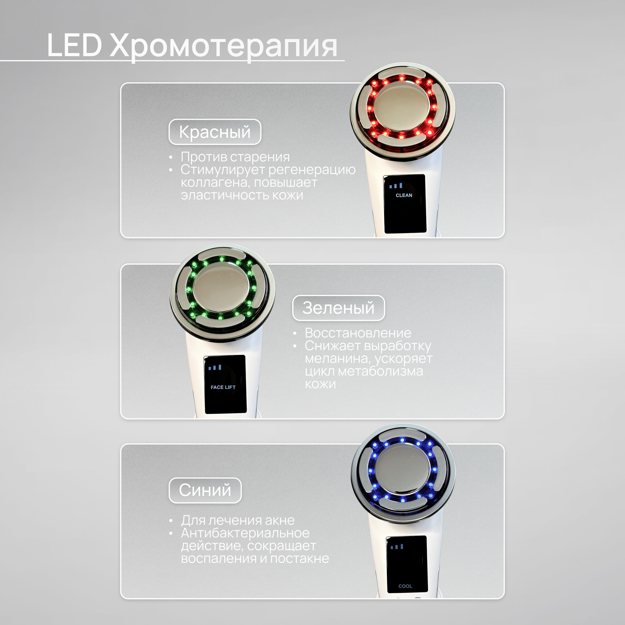 | Принцип работы | RF-лифтинг / вибрация / инфракрасное излучение / микротоки / светотерапия |