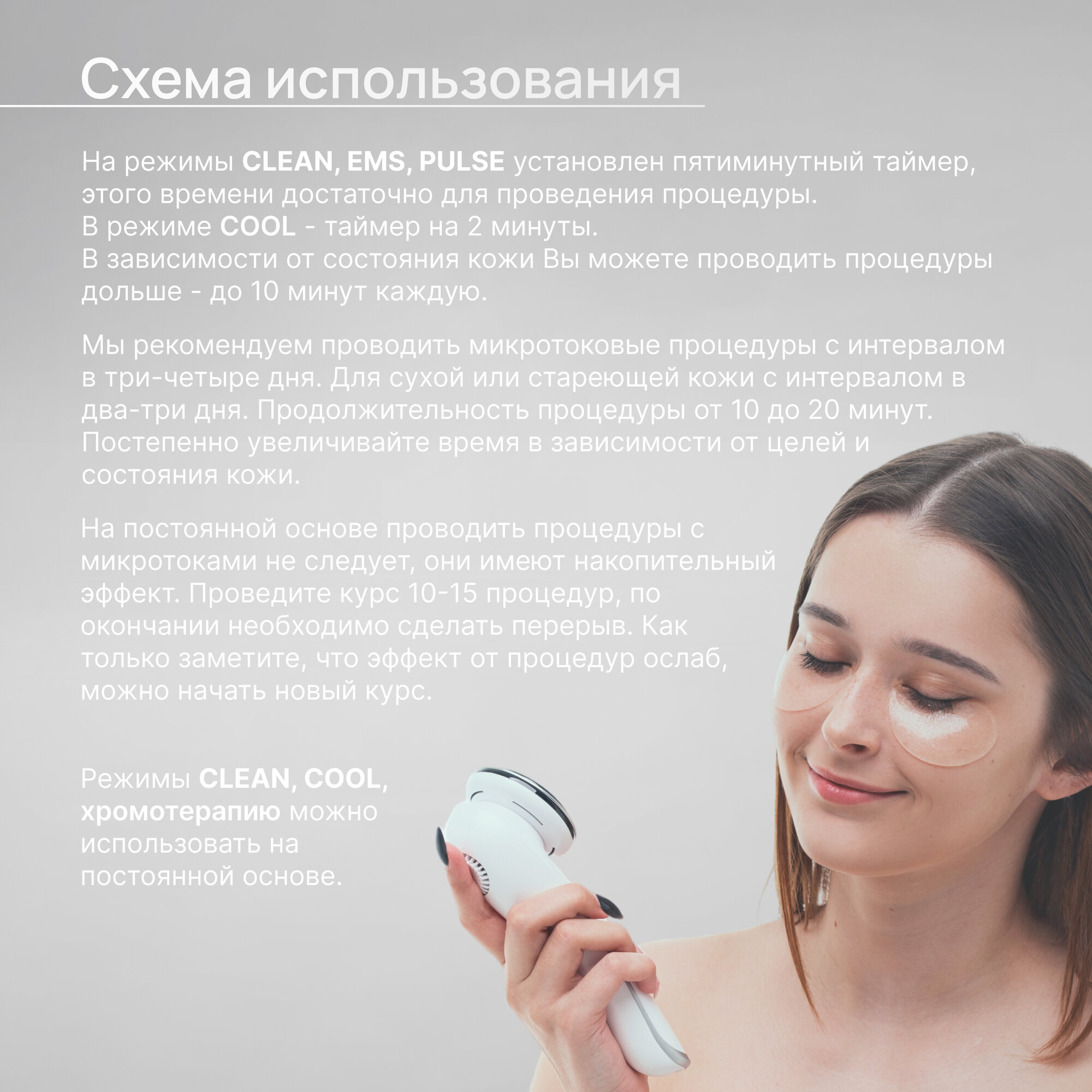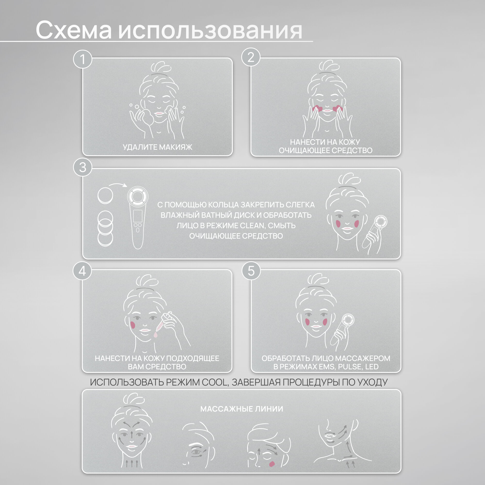 | Назначение | антивозрастной уход / лечение акне / массаж / нанесение средств по уходу / очищение / увлажнение / усиление действия косметических средств |