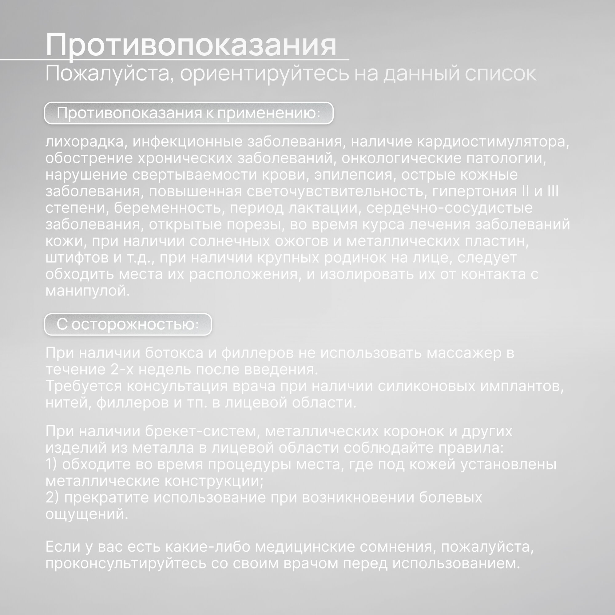 | Противопоказания | Беременность; Сердечно-сосудистые заболевания; Лихорадка; Инфекционные заболевания; Онкологические заболевания; Открытые порезы; Острые формы заболеваний; Гипотензия; Гипертония; Установленный кардиостимулятор; Во время курса лечения заболеваний кожи; При наличии солнечных ожогов и металлических пластин, штифтов и т.д. С осторожностью: При наличии брекет-систем; металлокерамики в зубных имплантах (обходя массажером зону с их наличием во избежание нагрева металлосодержащих частиц); при наличии крупных родинок на лице, следует обходить места их расположения, и изолировать их от контакта с манипулами. При ботоксе и филерах не рекомендуется(возможно снижение действия этих препаратов). |