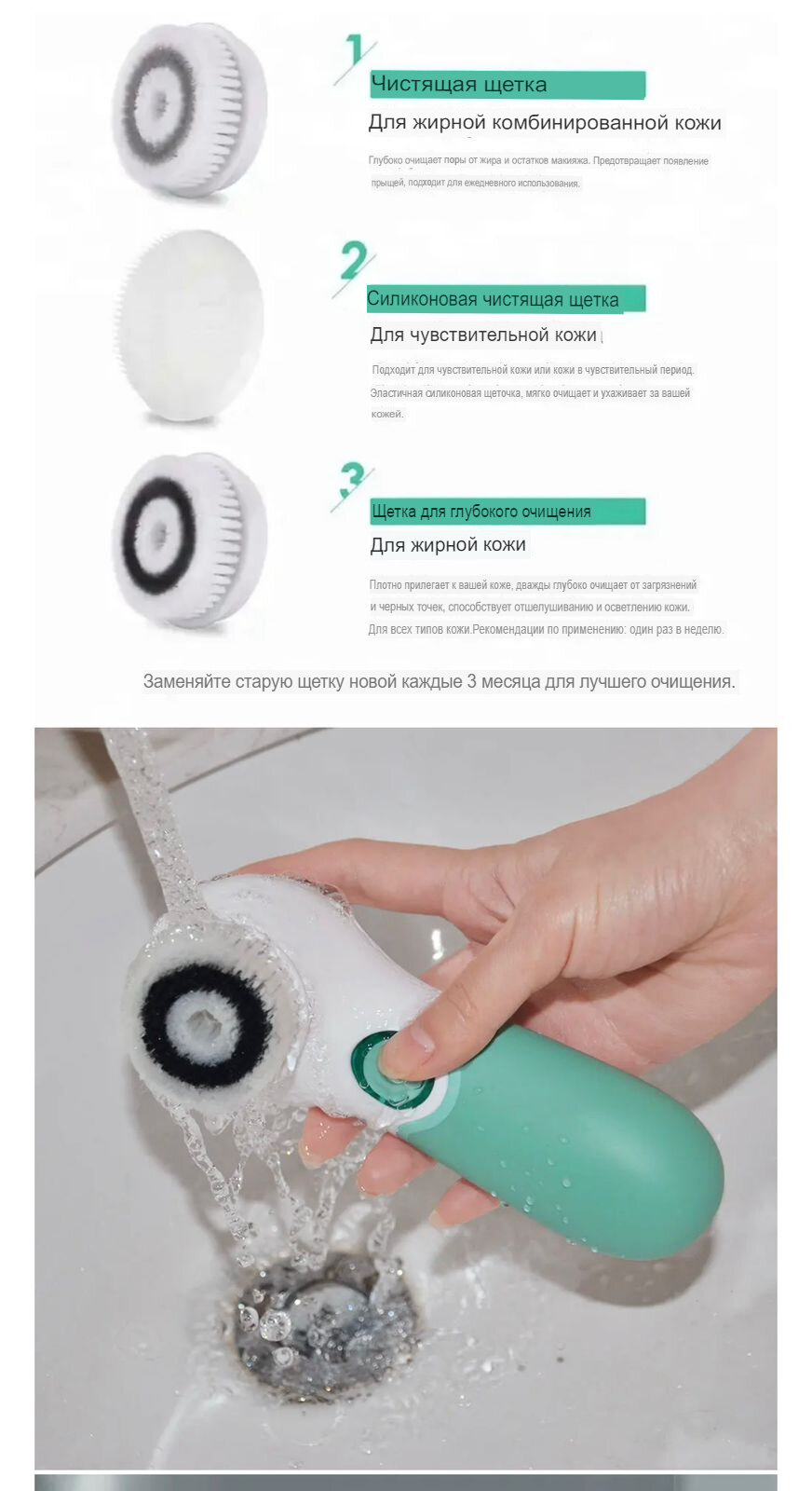Вращающаяся водонепроницаемая электрическая щетка для лица Queenwill с 3-мя сменными насадками для всех типов кожи интересное: