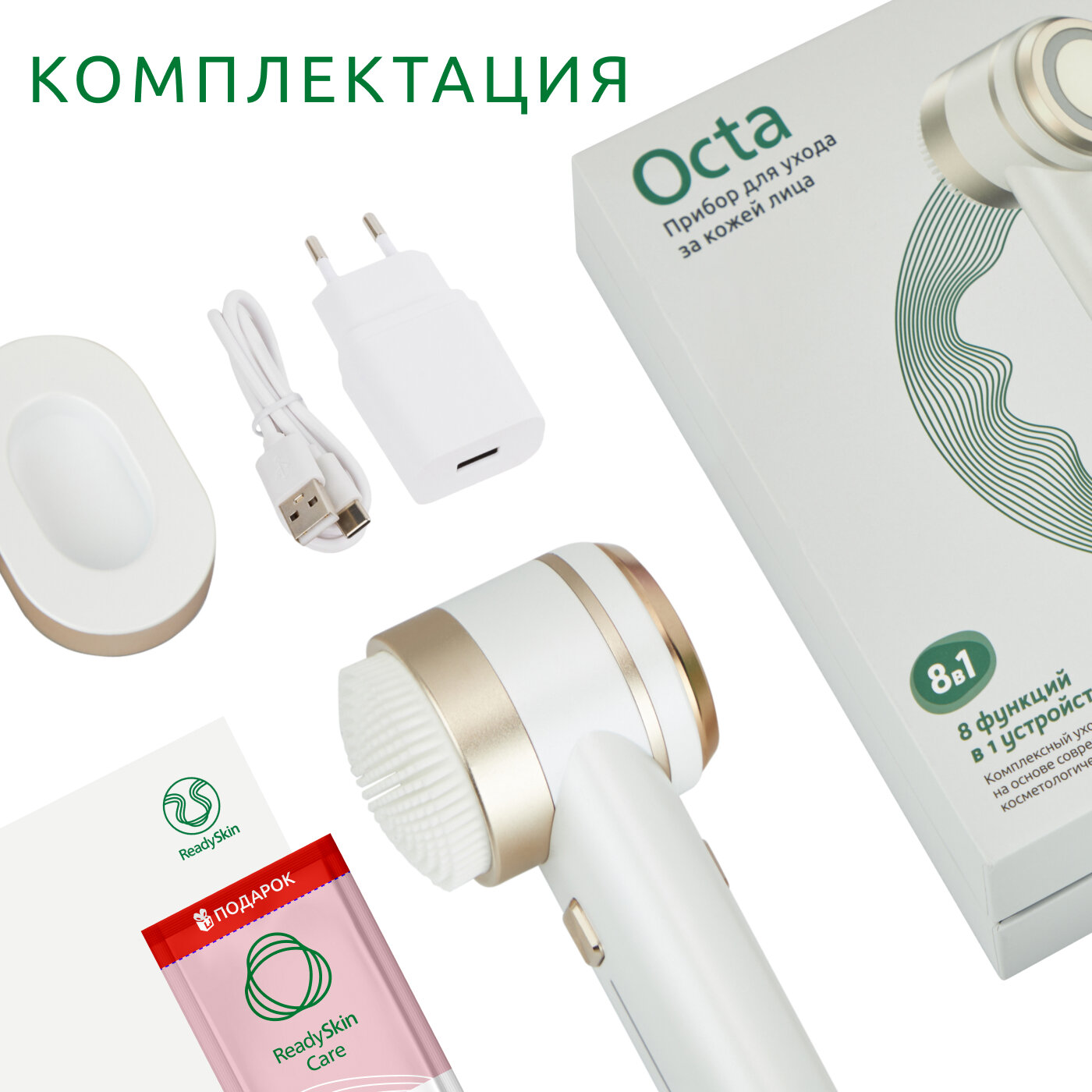 | Комплектность | 1. Аппарат ReadySkin Octa 2. Зарядная устройство-база 3. Адаптер питания для зарядного устройства 4. Салфетка для ухода за прибором 5. Тканевый мешочек для хранения и транспортировки прибора 6. Руководство по быстрому старту 7. Руководство пользователя |