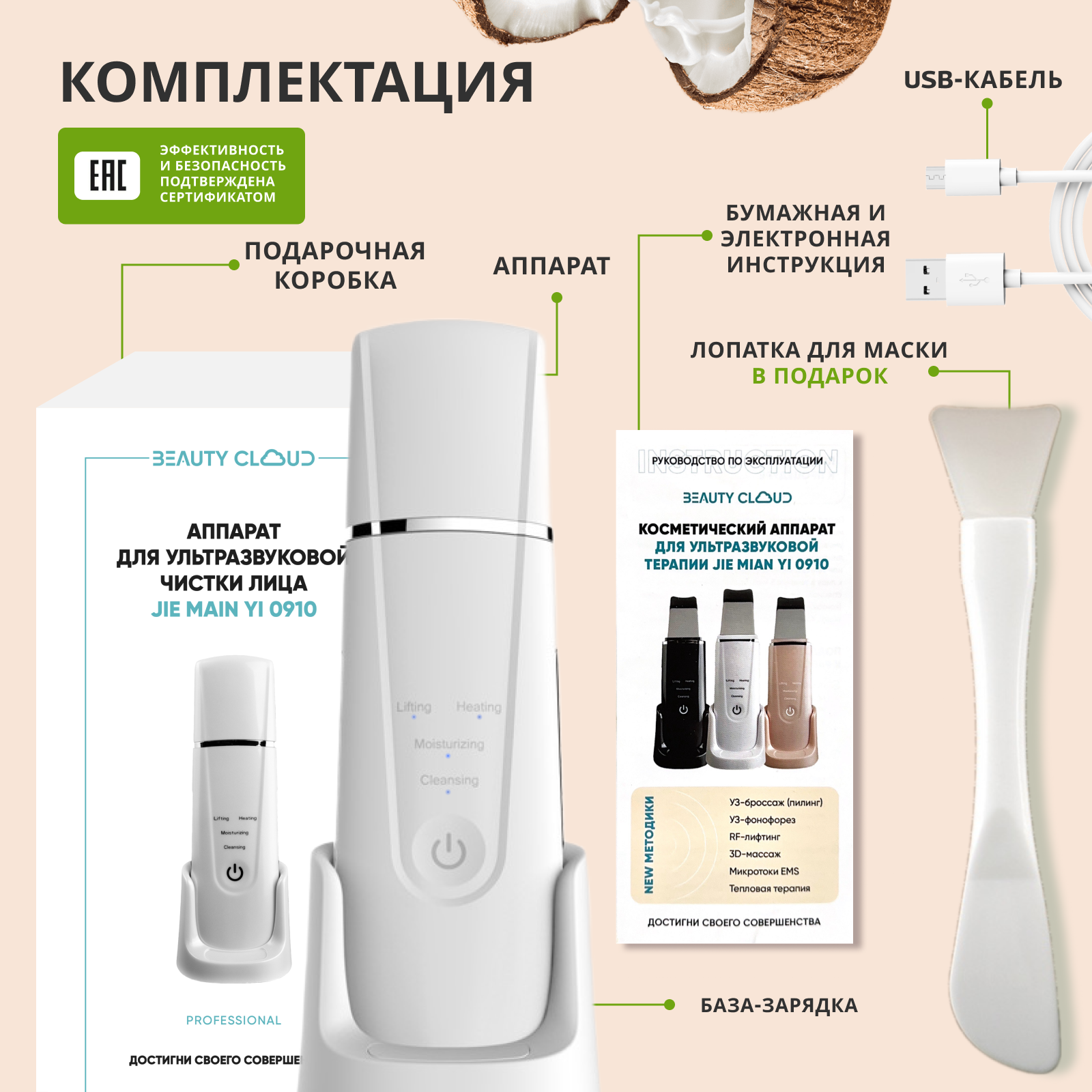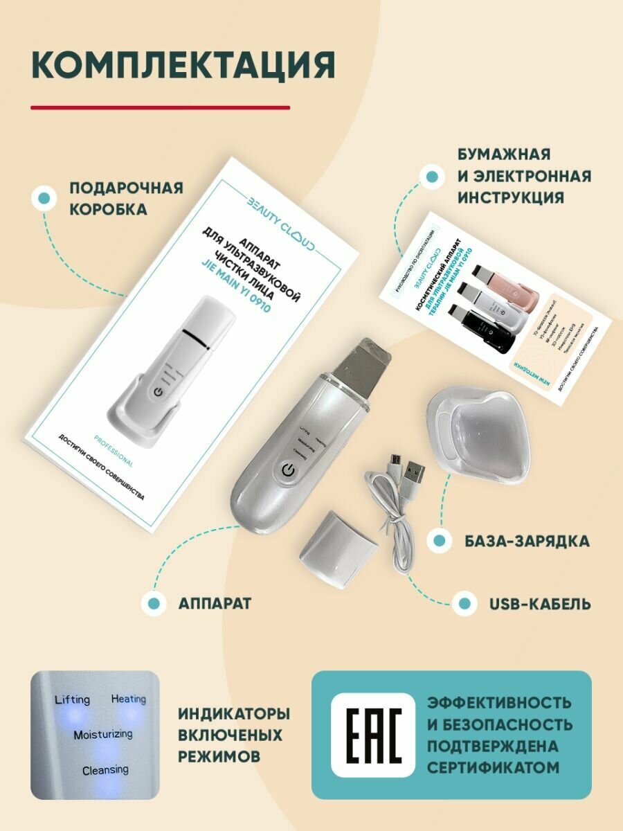 | Комплектность | массажный микротоковый аппарат для ультразвуковой чистки лица - 1шт;шнур для зарядки micro-USB -1шт;база-зарядка - 1шт;Инструкция на русском языке - 1шт;брендовая подарочная упаковка - 1шт |