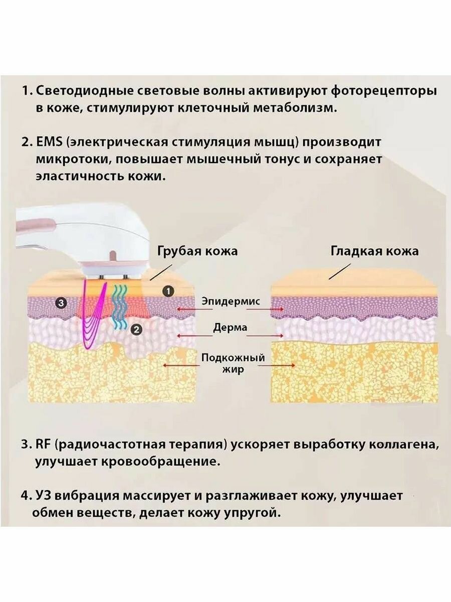 | Принцип работы | микротоки / светотерапия / ультразвук / фонофорез |