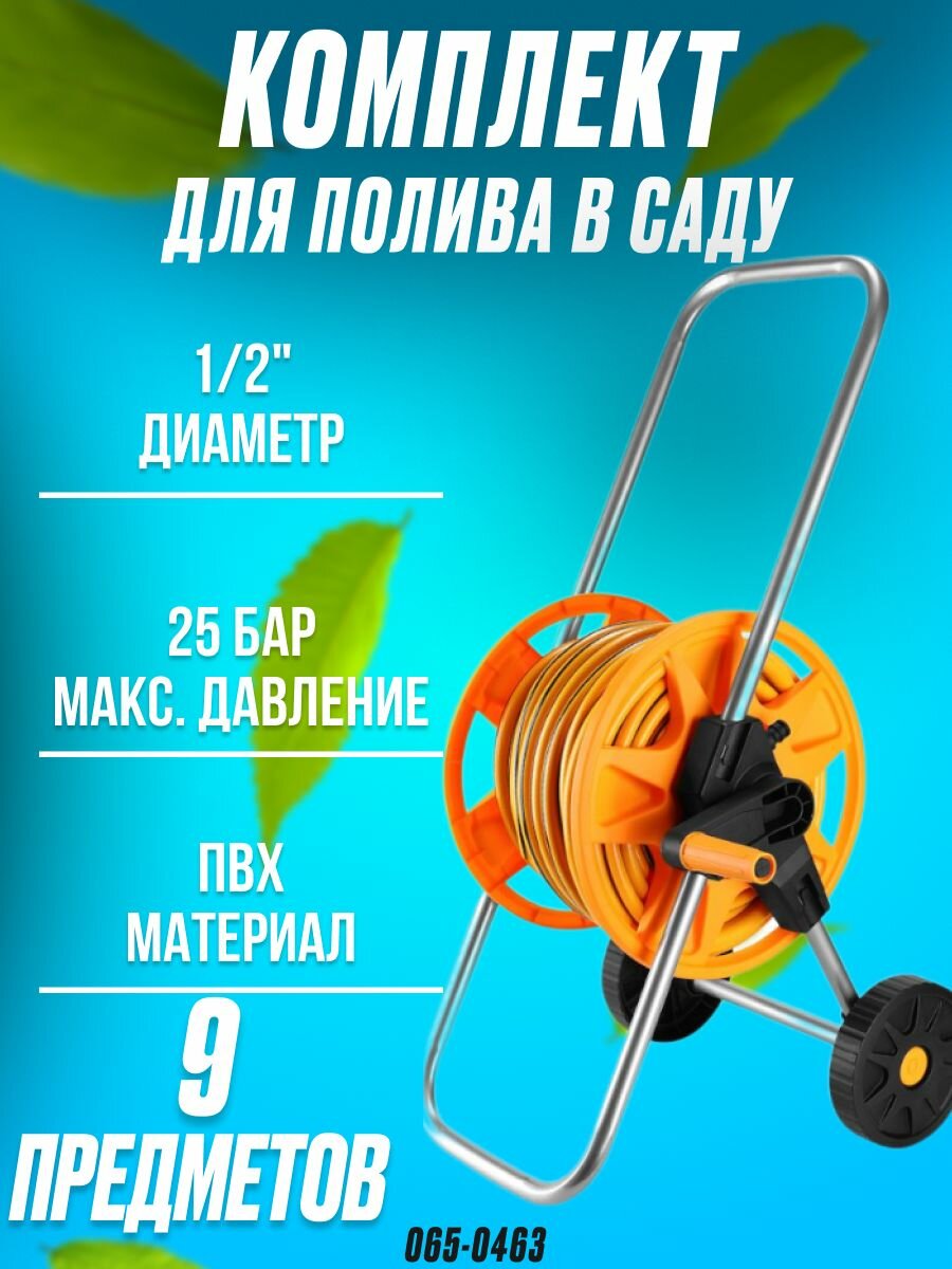 Набор для полива DEKO DKI025: DEKO катушка на колесах, шланг усиленный 1/2' 25м+2м, насадка для полива, коннекторы, 9 предмет 065-0463