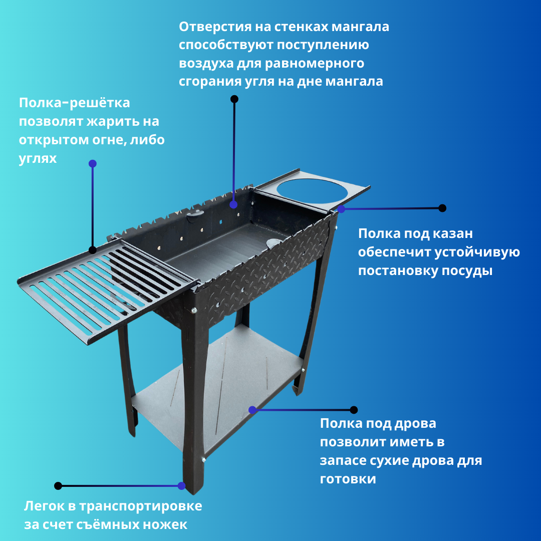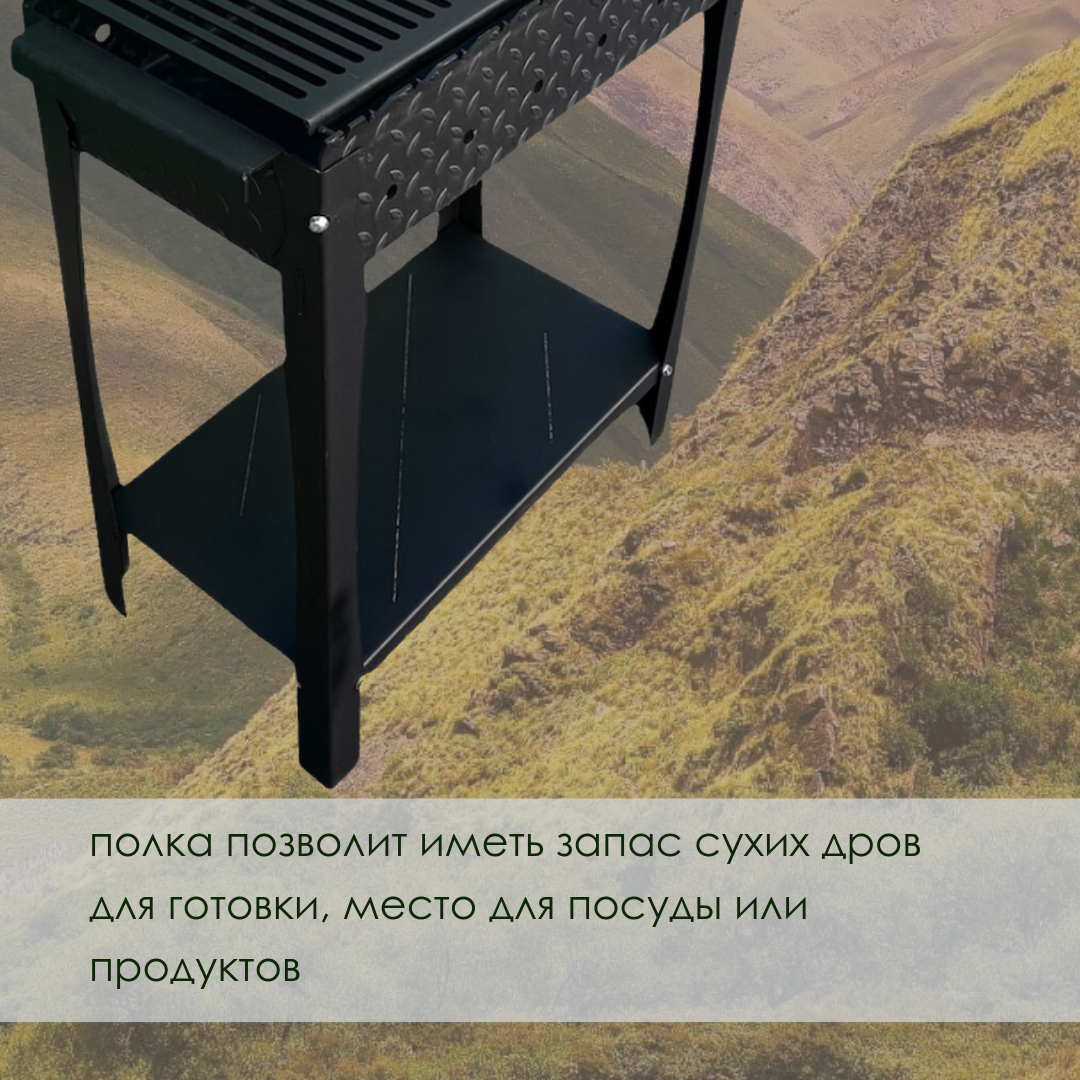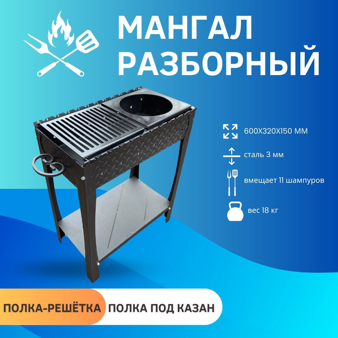 Мангал 600 мм с полкой-решёткой, полкой под казан и полкой под дрова сталь 3 мм разборный интересное: