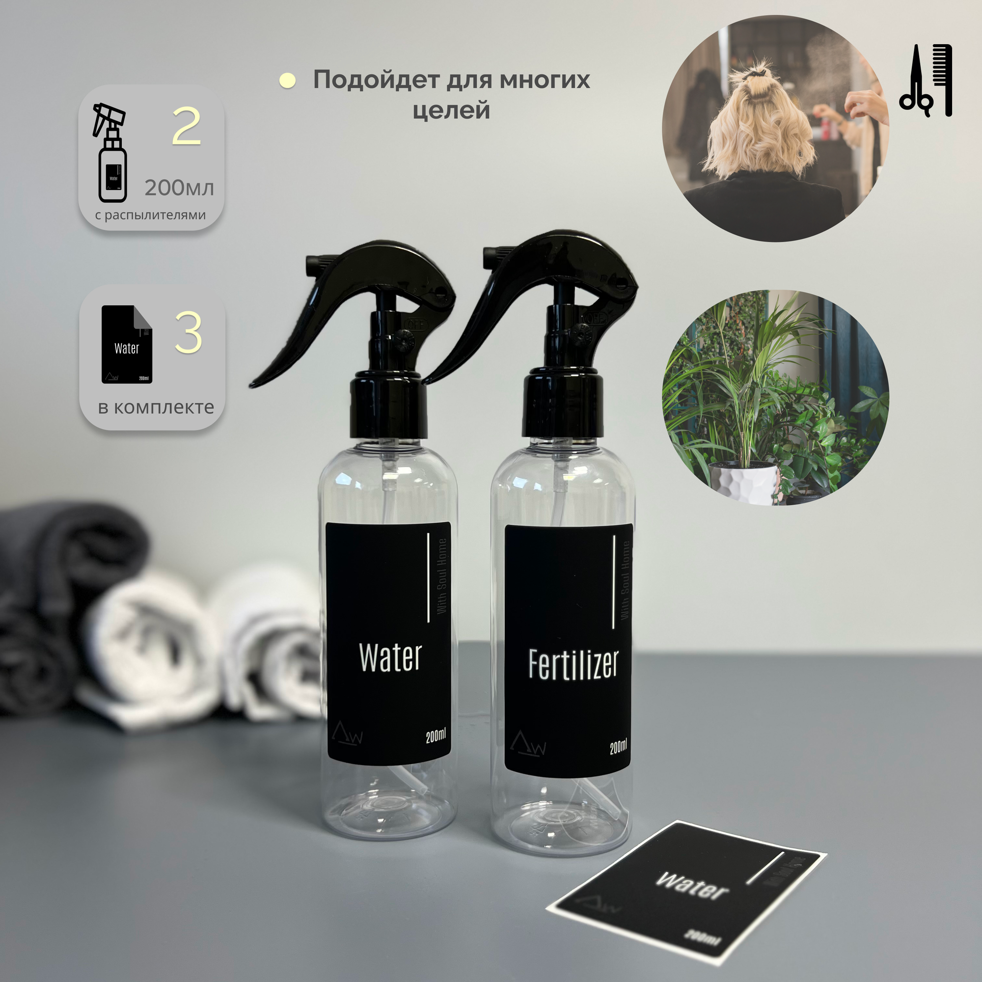 | Комплектация | - Флакон прозрачный 200мл - 2 шт. Наклейки 3 штуки: - Этикетка черная Water- 2 шт. - Этикетка черная Fertilizer- 1 шт. - Распылитель -2 шт. |